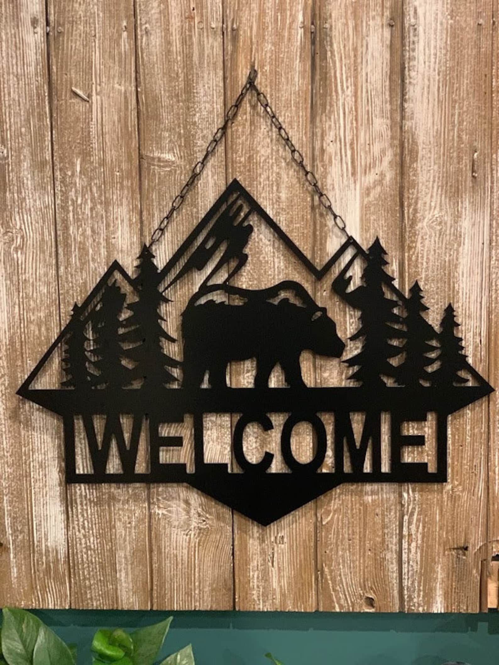 Choose to customize your Bear Scene Customized Cabin Sign with your last name, first names, ranch name, established year, house number, etc. Create your perfect sign for that perfect spot! Choose your color and hanging option. Our weatherproof material will last for years and years of decorating!