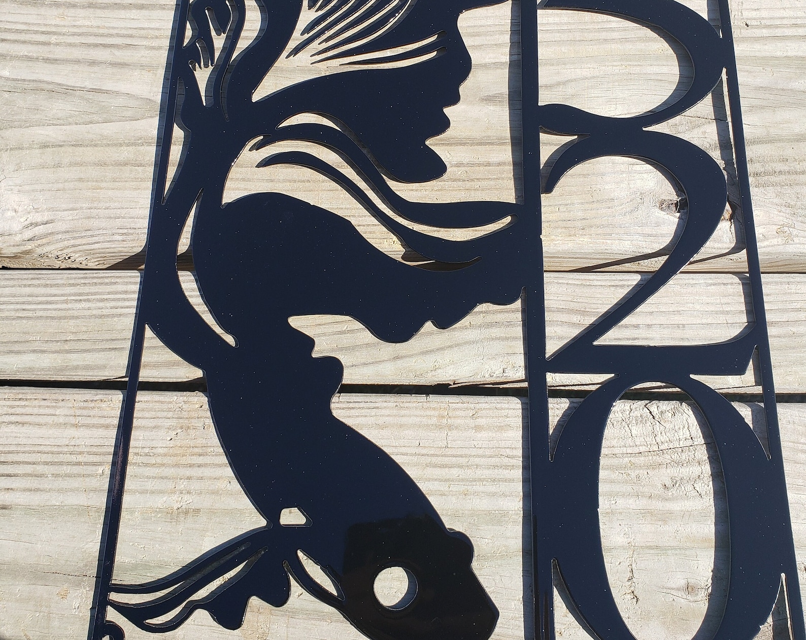 Custom designed beta fish metal address plate. Plasma cut from 16 gauge cold rolled steel and added holes for mounting on house or fence, screws not incl. Choose from heat blued with clear coat, shined metal with clear coat, white, black, bronze. All items are powder coated giving them lasting uv protection and durability.