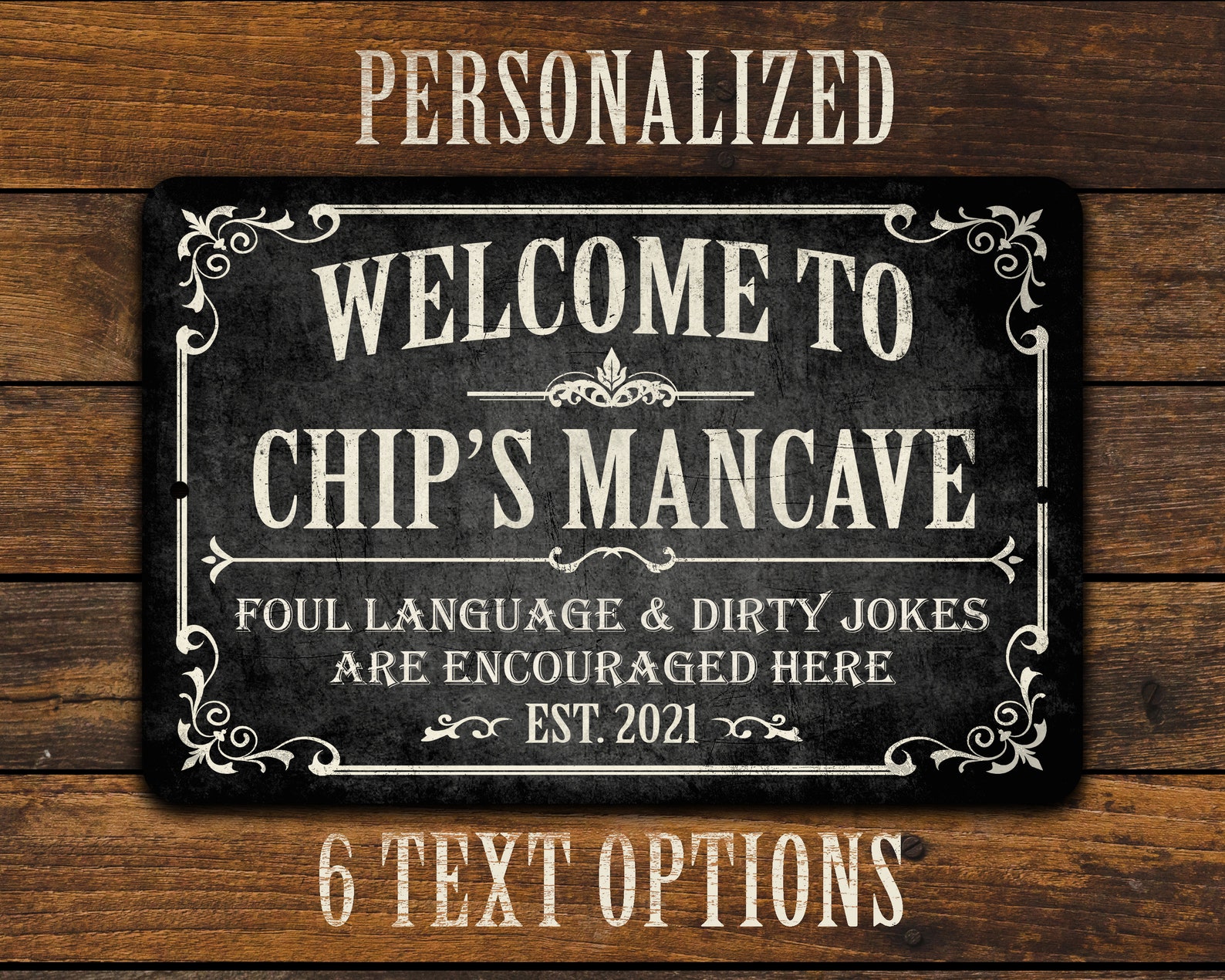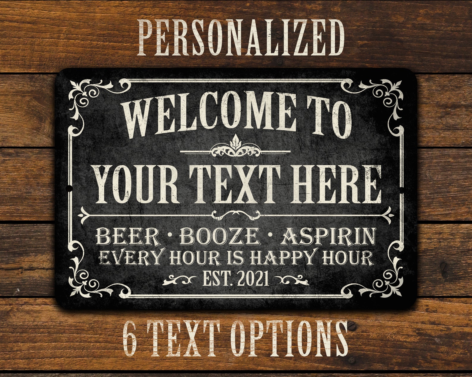 3) Enter your personalization information. Type the et text or phrase you9;d like printed on the sign for the bar name, followed by an established year. Your text will be printed in ALL CAPS only. For best results, please limit to no more than 20 characters. The more characters you use, the smaller the text will have to be to fit. If no established date is provided, the current year (2024) will be used.