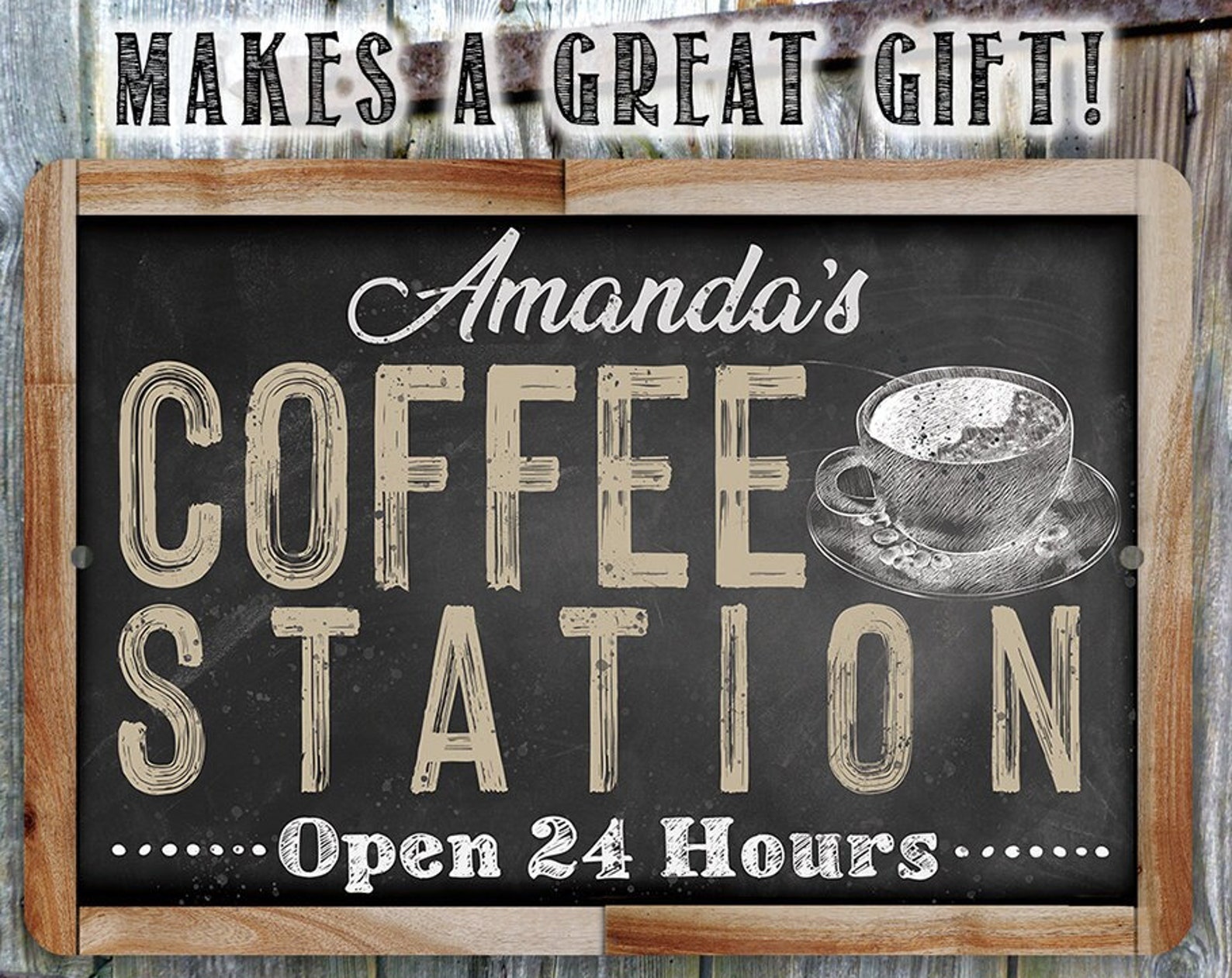 Tin – Personalized Metal Sign – Coffee Station Open 24 Hours (Chalkboard Look) – 8"" or 12"" Use Indoor/Outdoor -Coffee Shop Decor