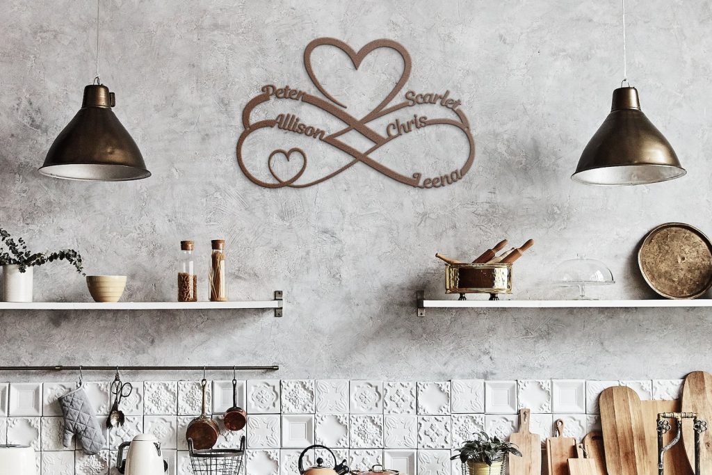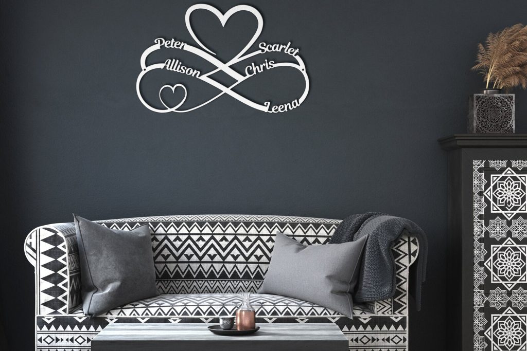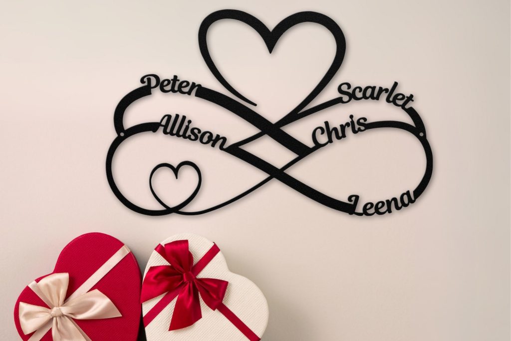 Add a heartfelt touch to your home decor with our 5 Names Infinity Heart Metal Sign. This custom-made love sign will instantly infuse love and warmth into any room, making it perfect for over the bed decor. Celebrate your everlasting love and create a lasting impression with this unique anniversary gift. Not only is this a beautiful family keepsake, but it also makes a wonderful gift for mom. Personalize this metal sign with the names of your loved ones, creating a piece that is as unique as your family9;s bond.