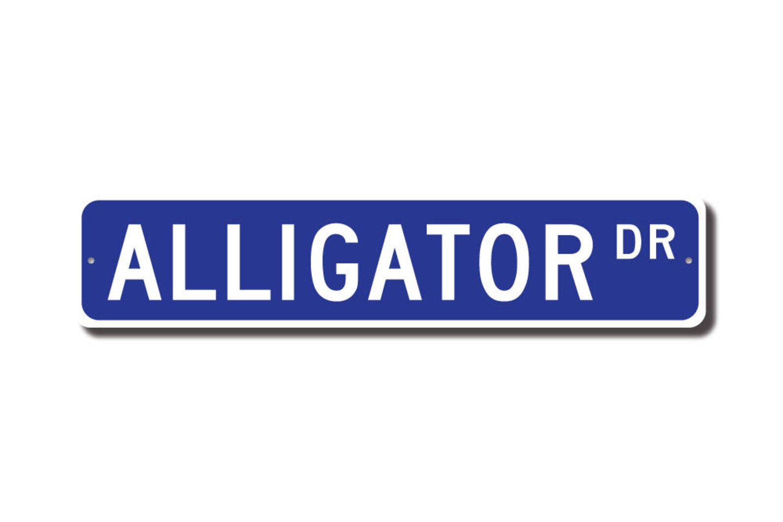 Alligator lovers check out this awesome street sign! This will make the perfect piece for any Alligator owner, or maybe you are an Alligator lover and looking for a cool decor piece. Made of premium aluminum it will stand the test of time. This sign will look great in any room, home den, cave, or office! Get this sign for your favorite Alligator aficionado !