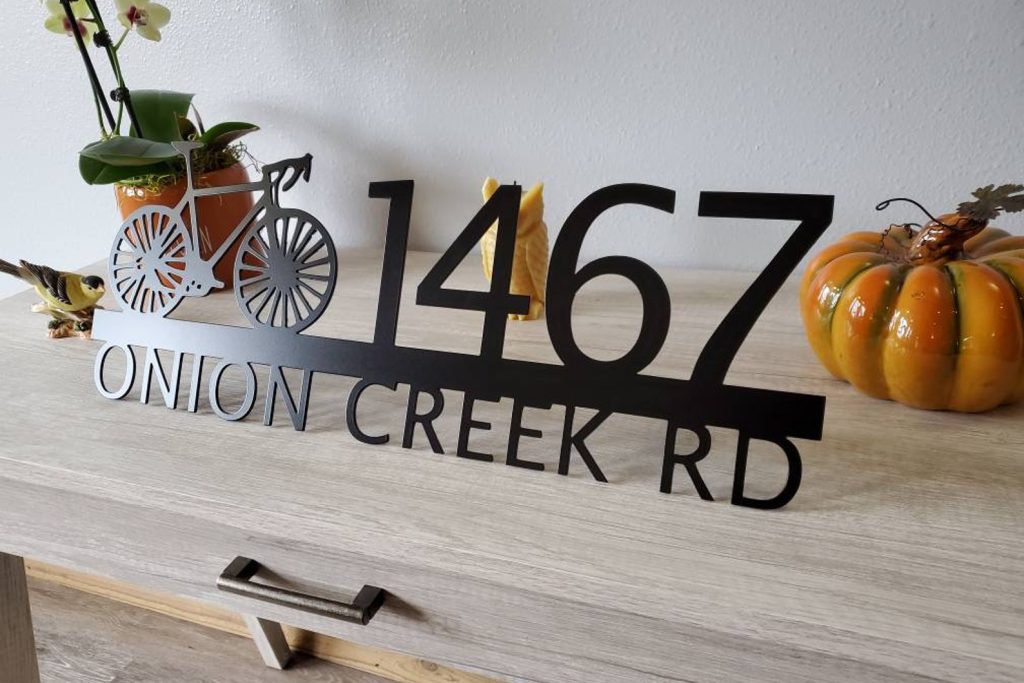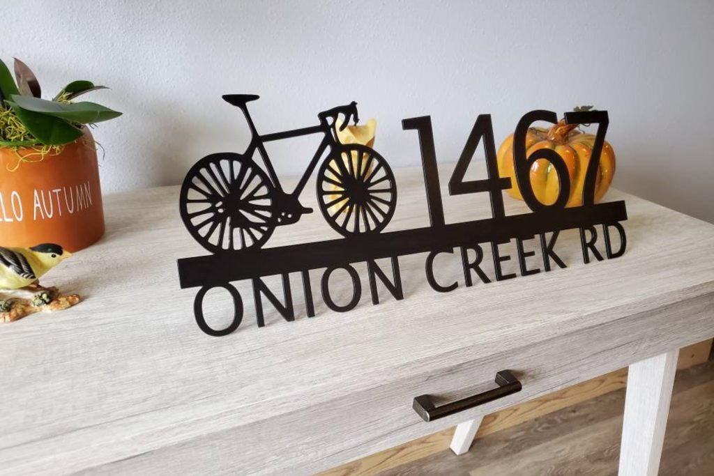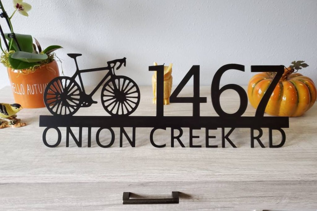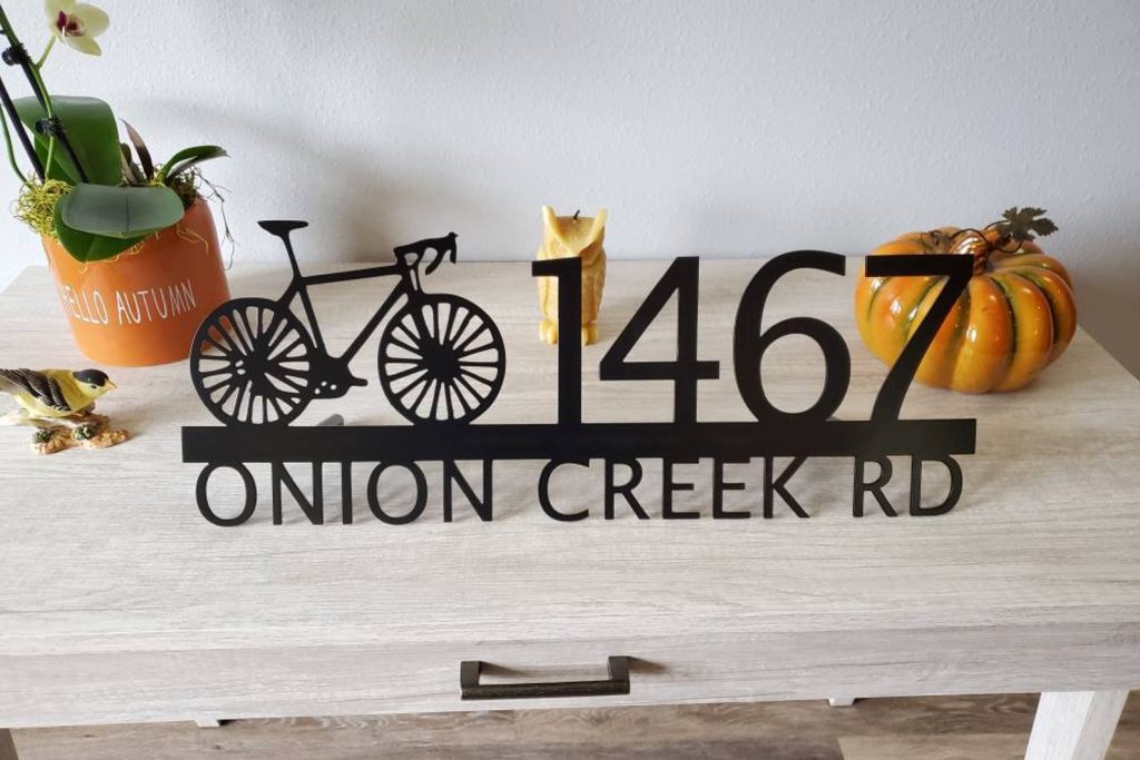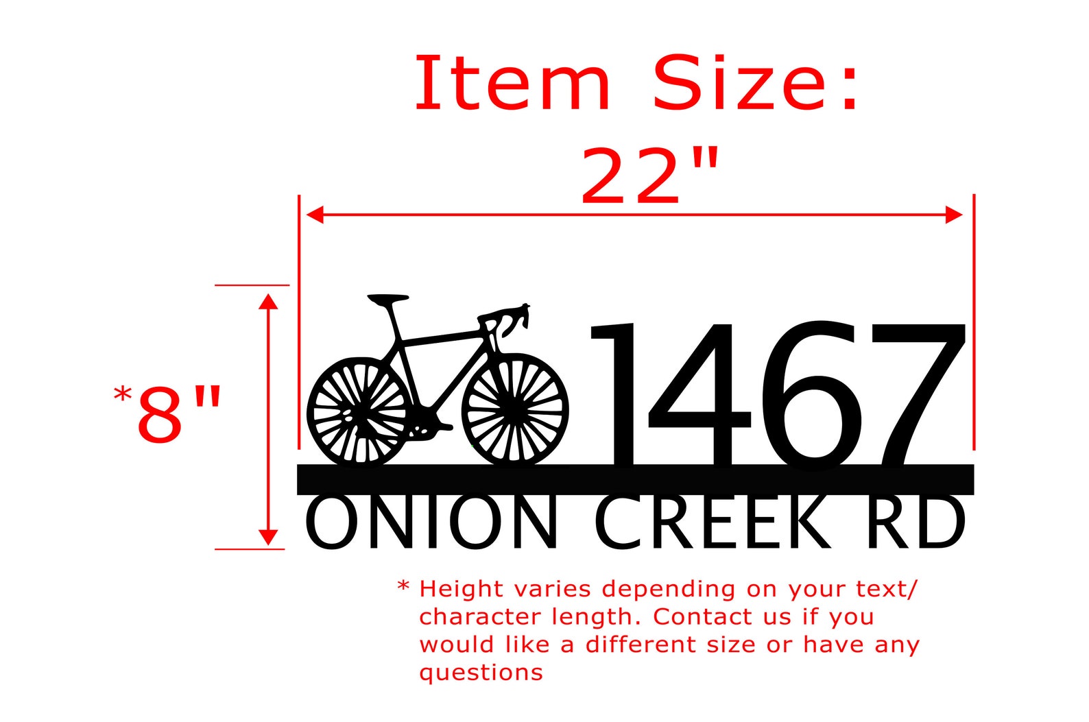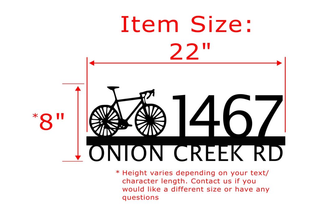 Custom metal personalized address sign/house numbers with bicycle bike for your rock or wall. Finished with highly durable exterior matte black powder coating. This address sign is made out of highly quality durable/sturdy 1/8 inch thick steel(12gauge). This gives the item a very sturdy feel. Item comes as shown in listing photos numbers are offset to the right. We will send you a mock-up of the design. Size is 8 but the height does vary slightly depending on text length.