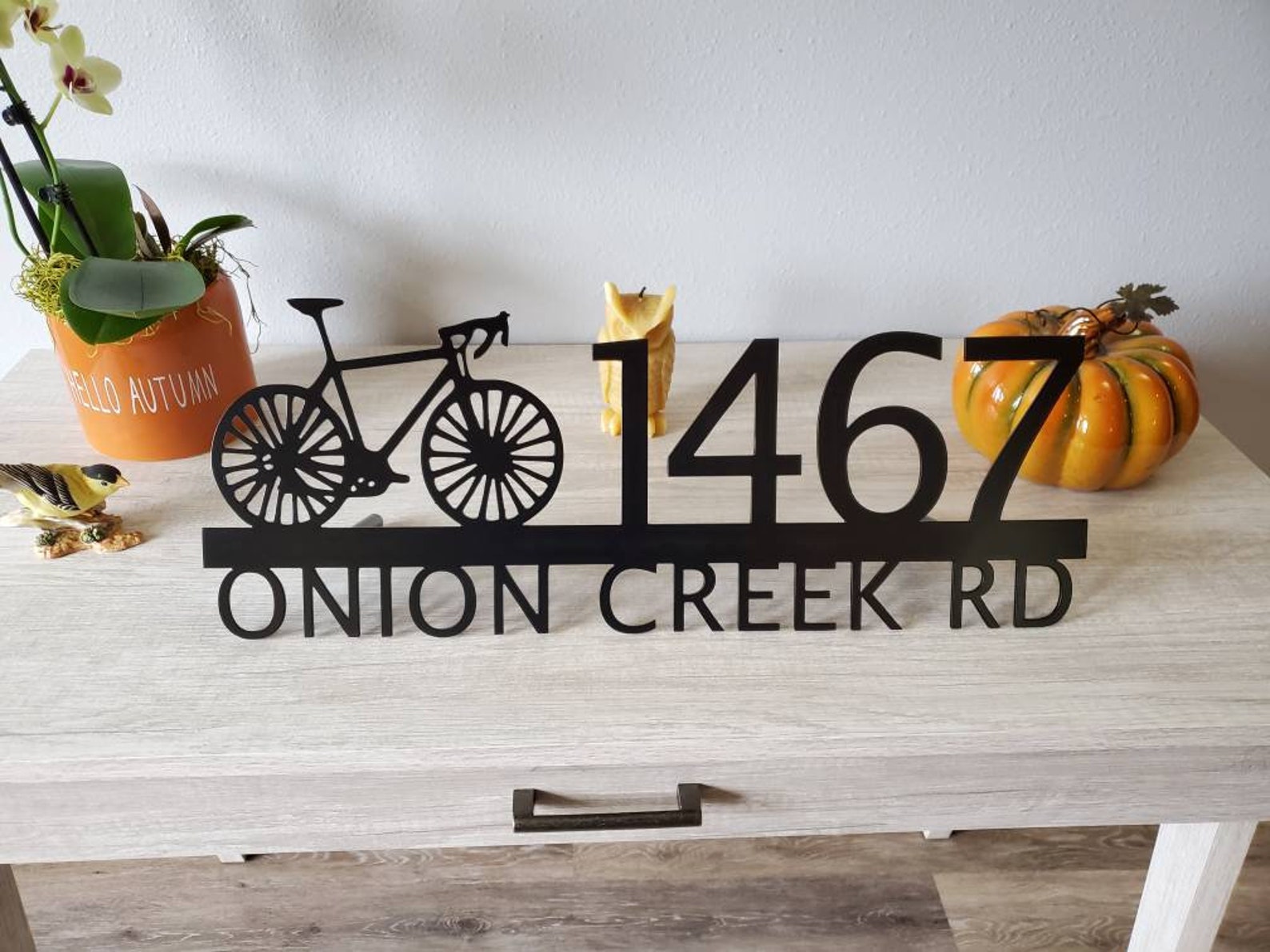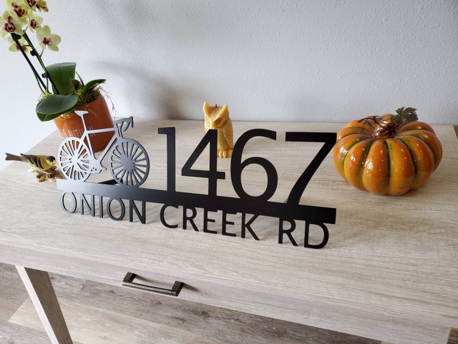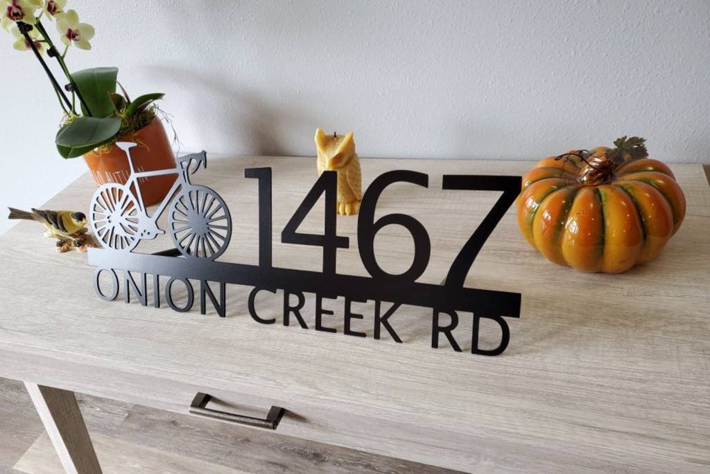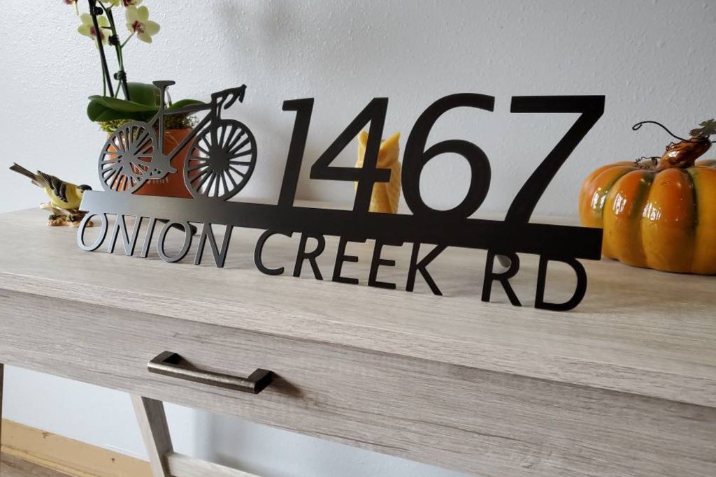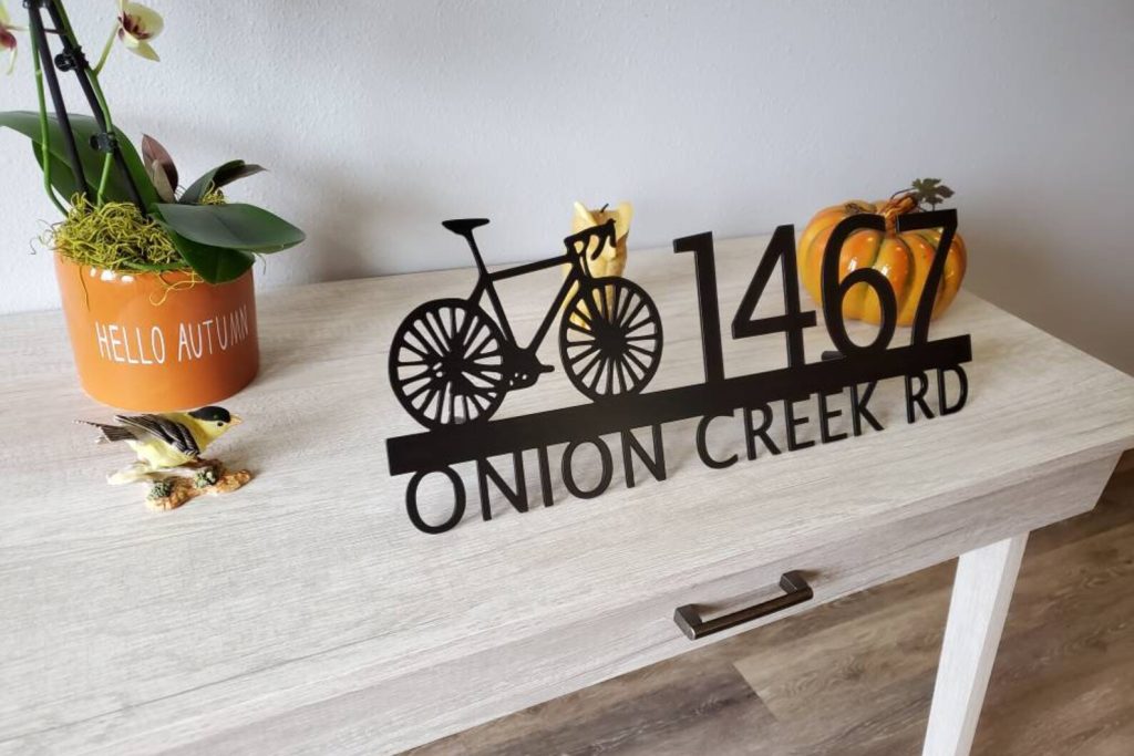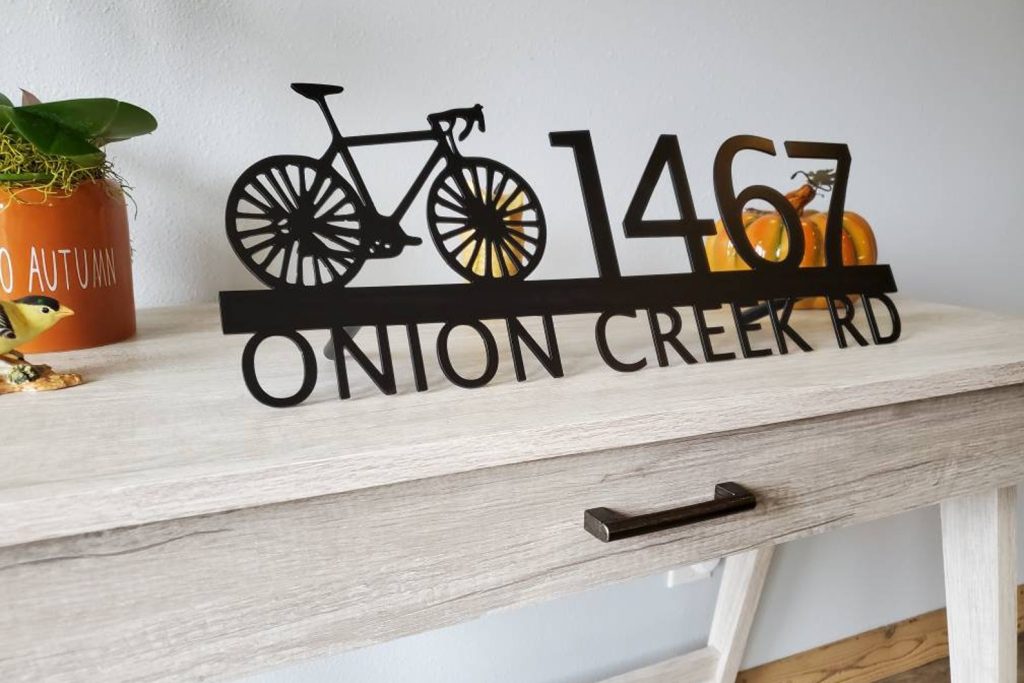 Custom metal personalized address sign/house numbers with bicycle bike for your rock or wall. Finished with highly durable exterior matte black powder coating. This address sign is made out of highly quality durable/sturdy 1/8 inch thick steel(12gauge). This gives the item a very sturdy feel. Item comes as shown in listing photos numbers are offset to the right. We will send you a mock-up of the design. Size is 8 but the height does vary slightly depending on text length.