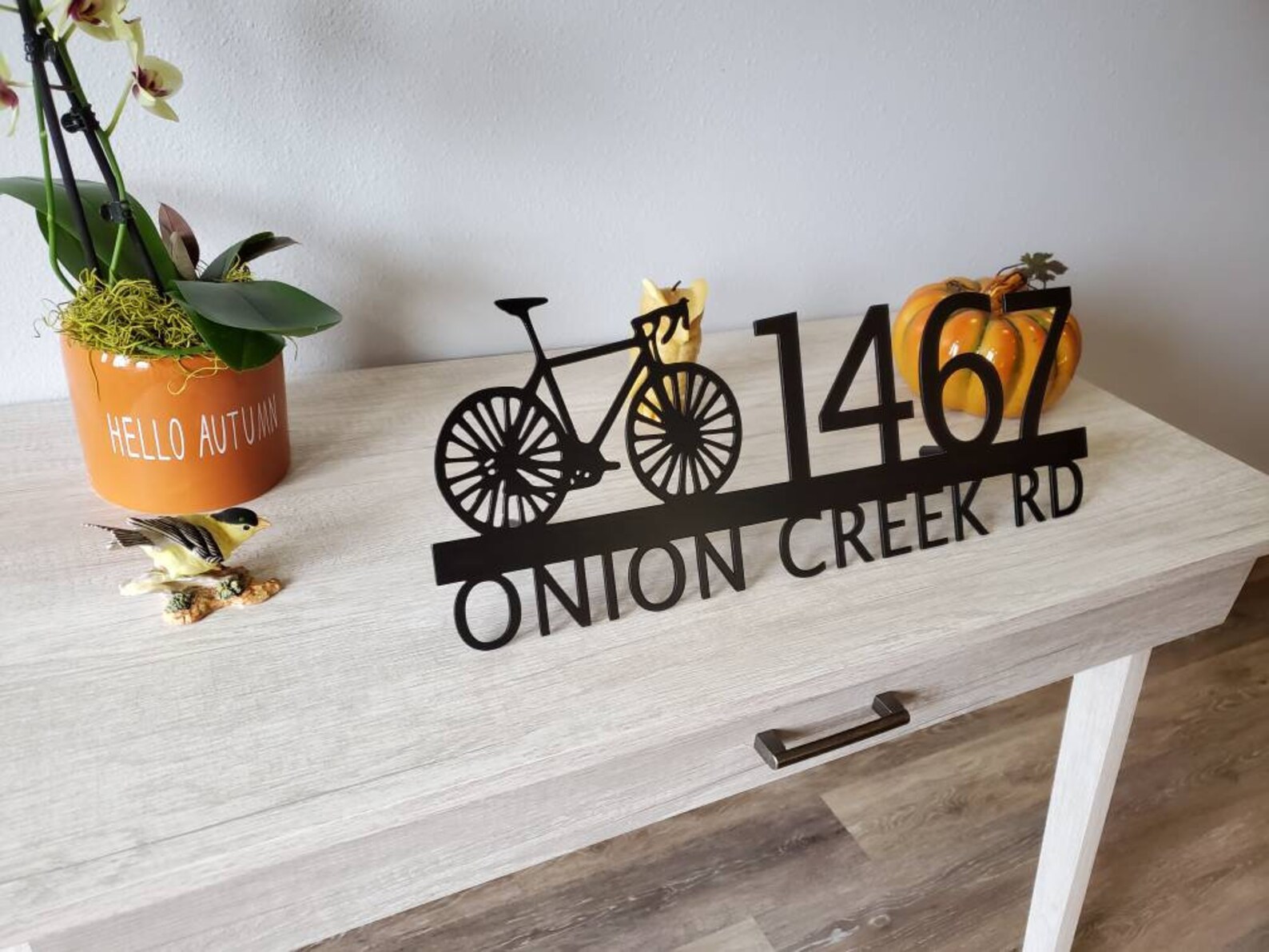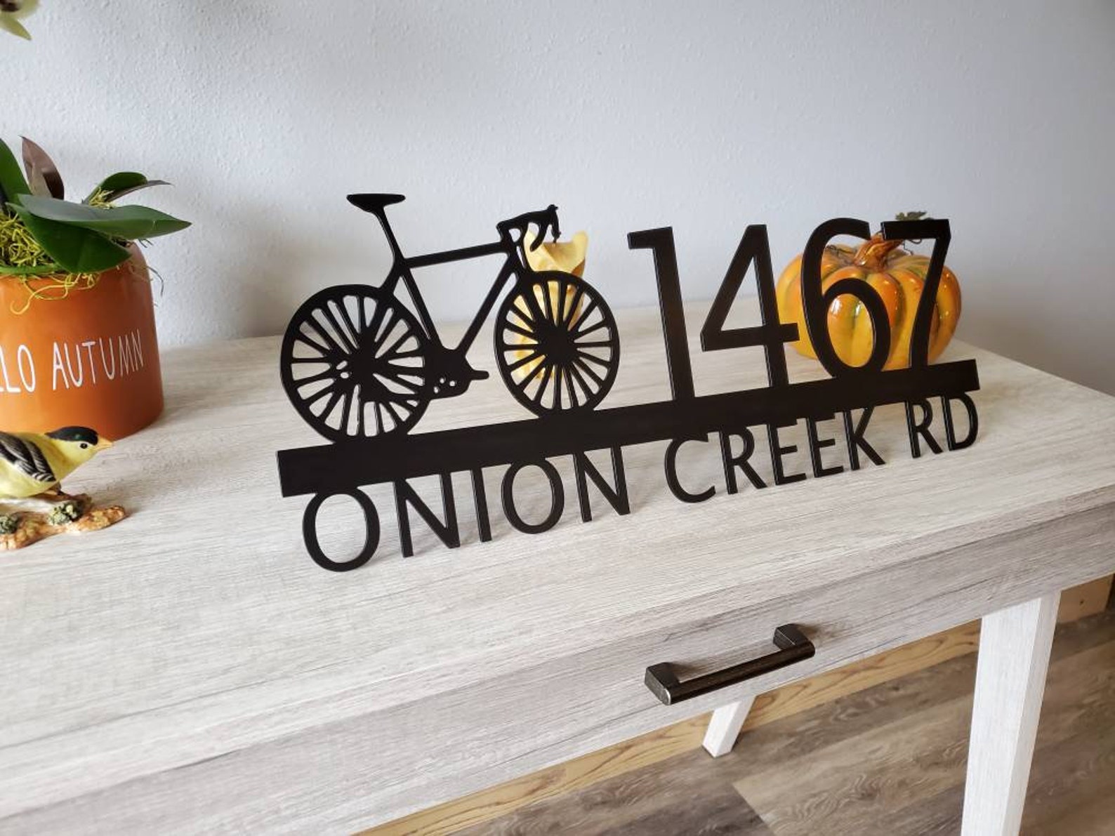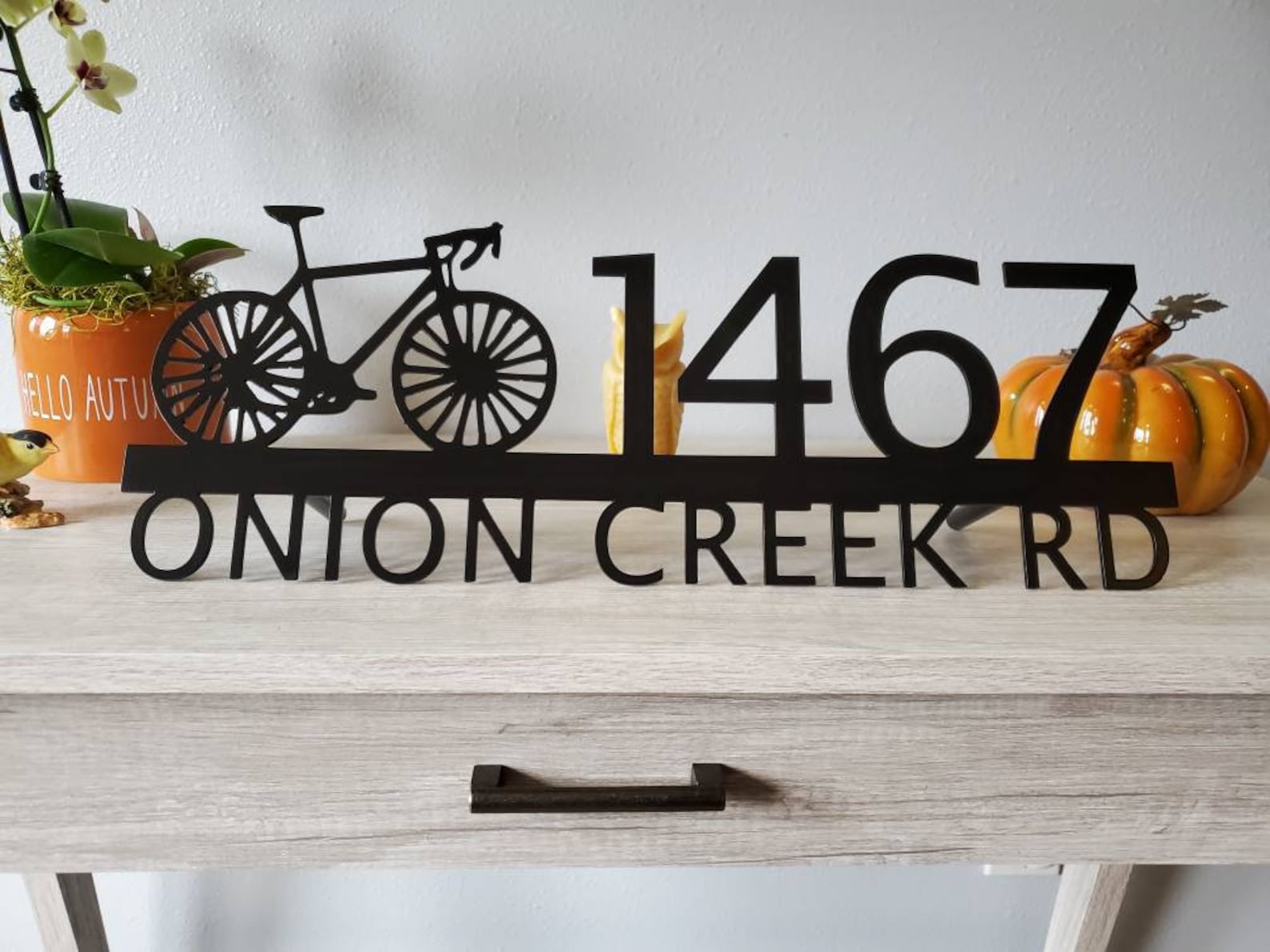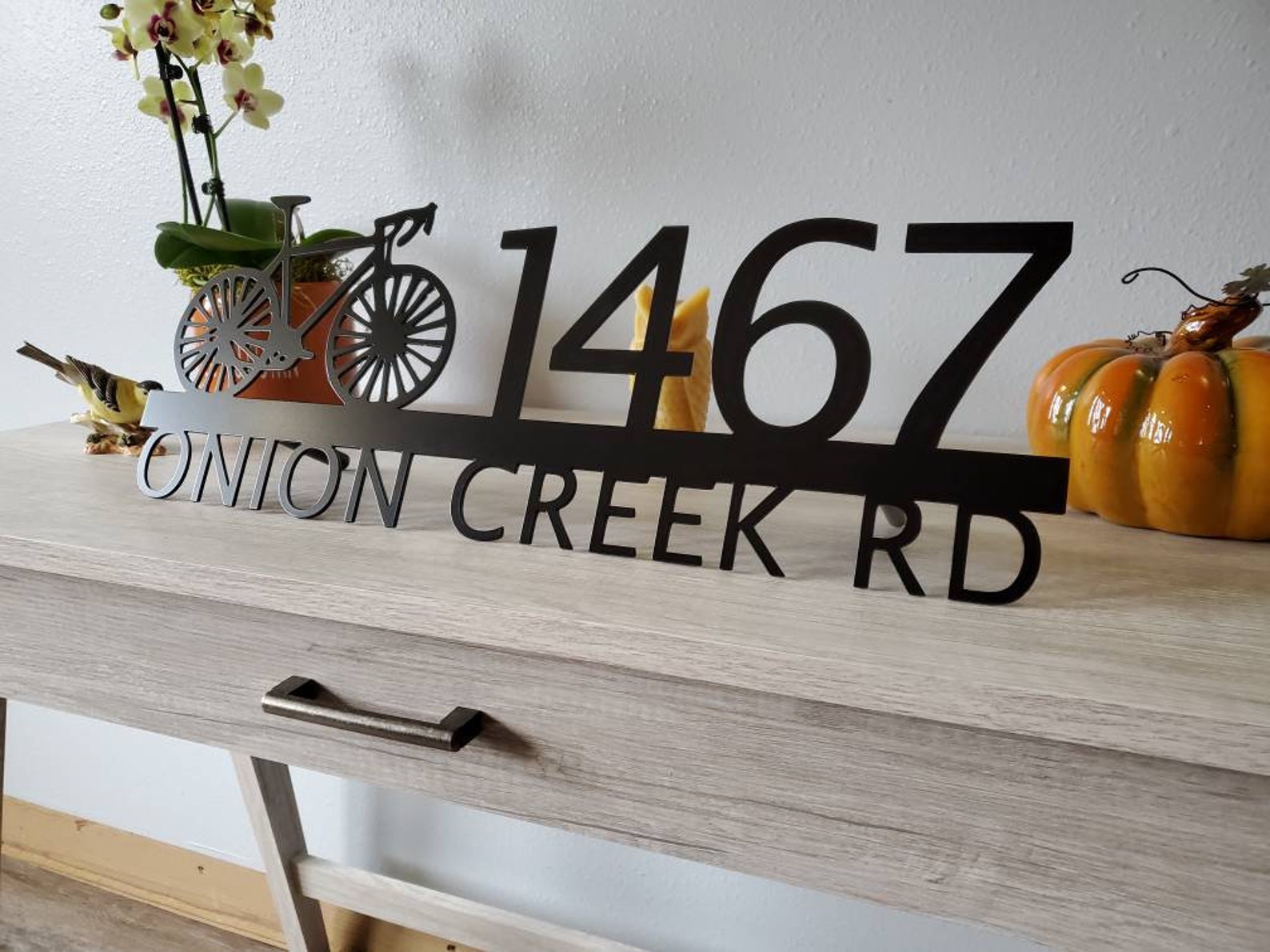 Custom metal personalized address sign/house numbers with bicycle bike for your rock or wall. Finished with highly durable exterior matte black powder coating. This address sign is made out of highly quality durable/sturdy 1/8 inch thick steel(12gauge). This gives the item a very sturdy feel. Item comes as shown in listing photos numbers are offset to the right. We will send you a mock-up of the design. Size is 8 but the height does vary slightly depending on text length.