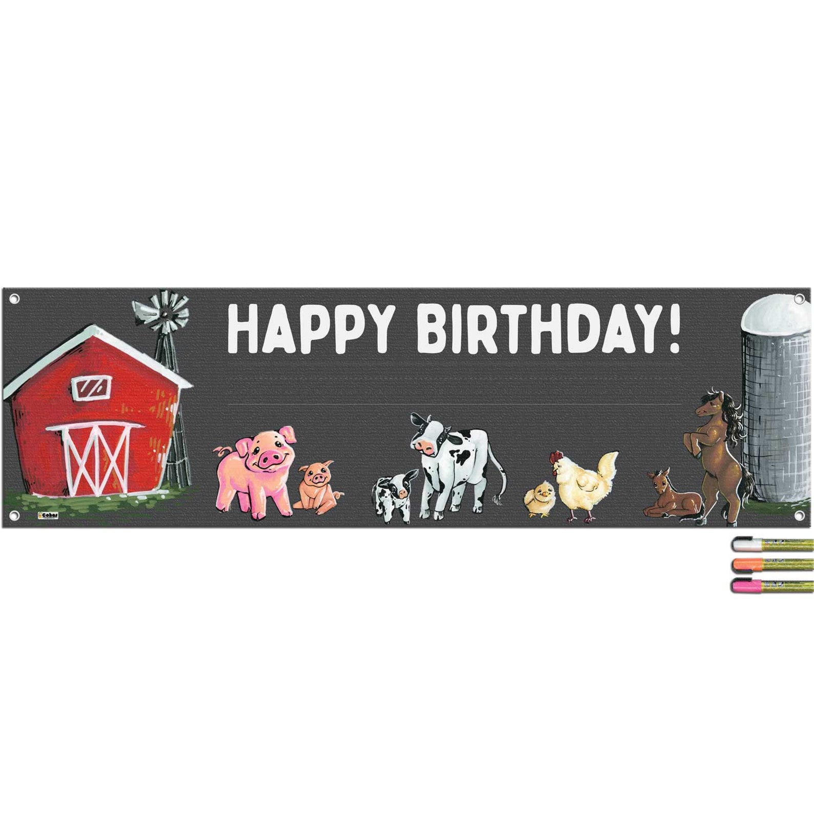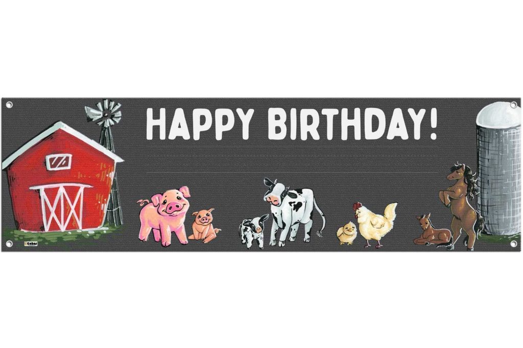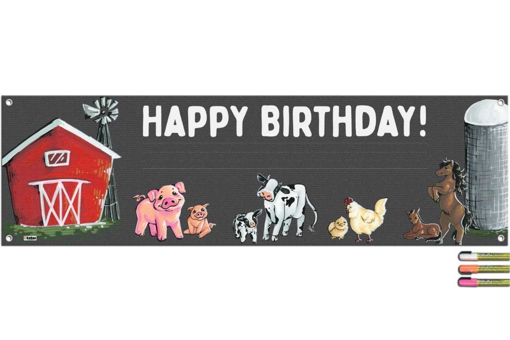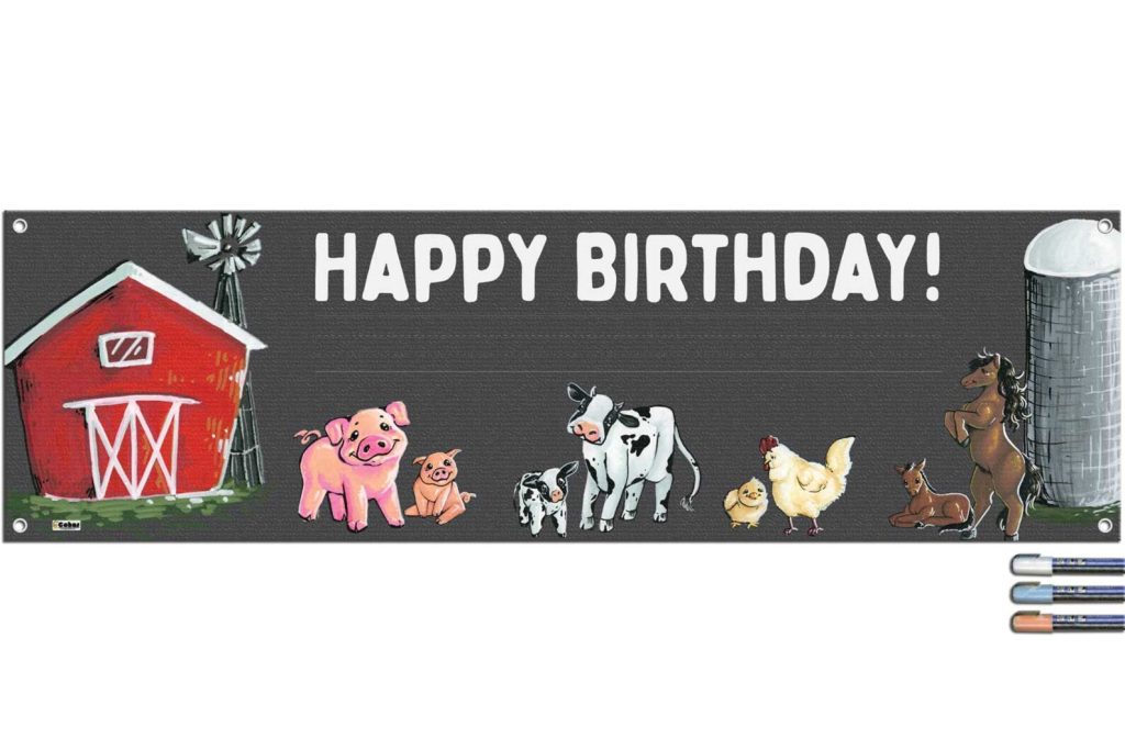 Features real chalk art! Each banner has a barn, pig, cow, chicken, and horse parent and child that have been hand drawn by one of our artists with liquid chalk markers. Images, text, and lines are embedded into the banner for a longer life.