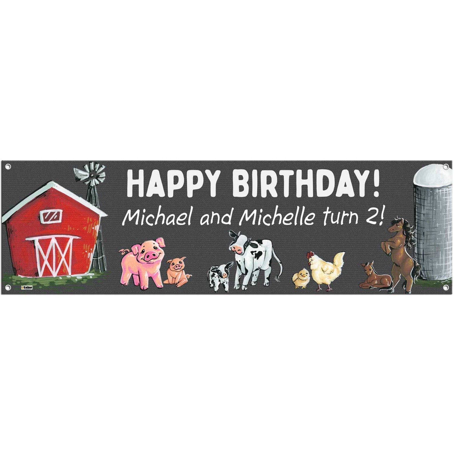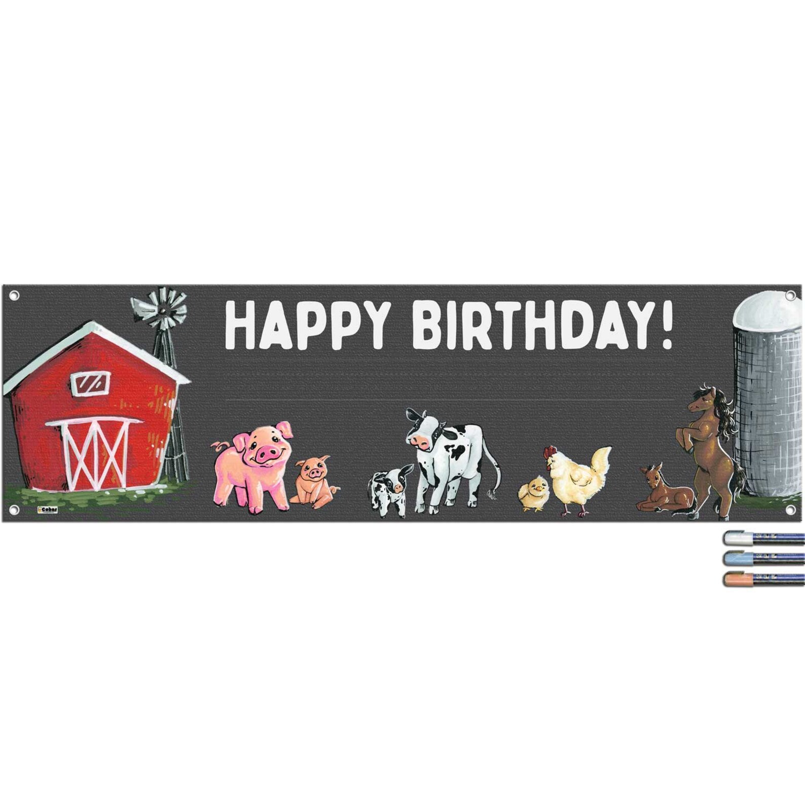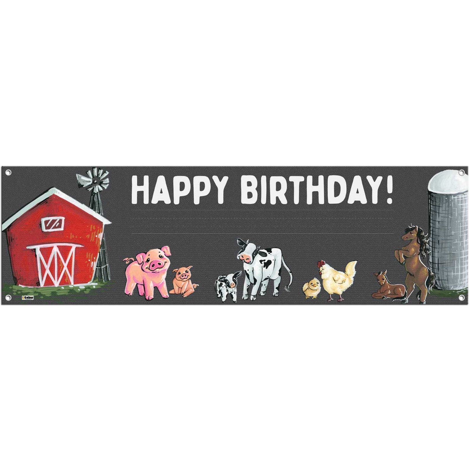 Features real chalk art! Each banner has a barn, pig, cow, chicken, and horse parent and child that have been hand drawn by one of our artists with liquid chalk markers. Images, text, and lines are embedded into the banner for a longer life.