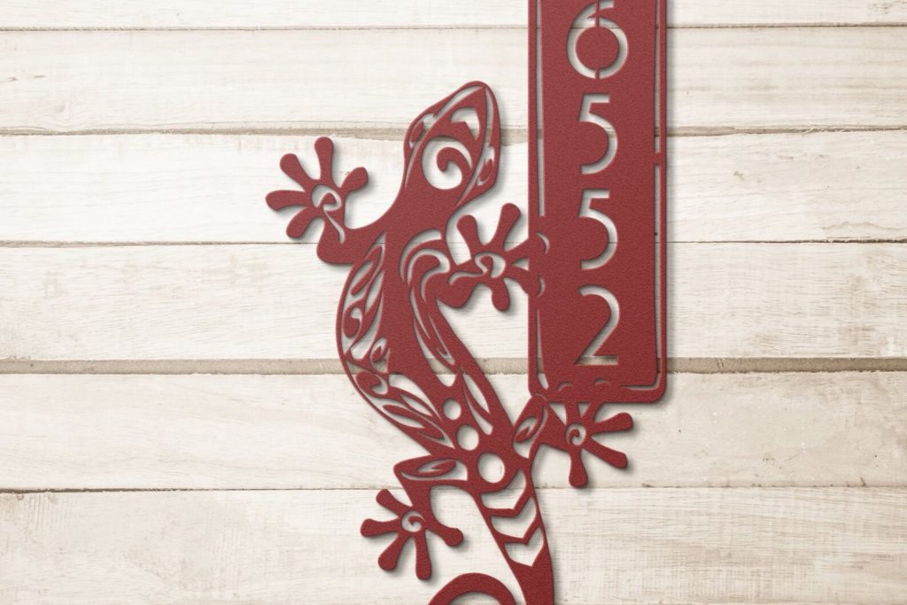 Gecko metal house number sign. Elevate your home decor with a beautiful metal wall sign. Made with 18 gauge steel and powder coated in your choice of 5 colors, this sign is built to withstand the elements for years of enjoyment. Add a touch of elegance to your home on the inside, outside, or both!