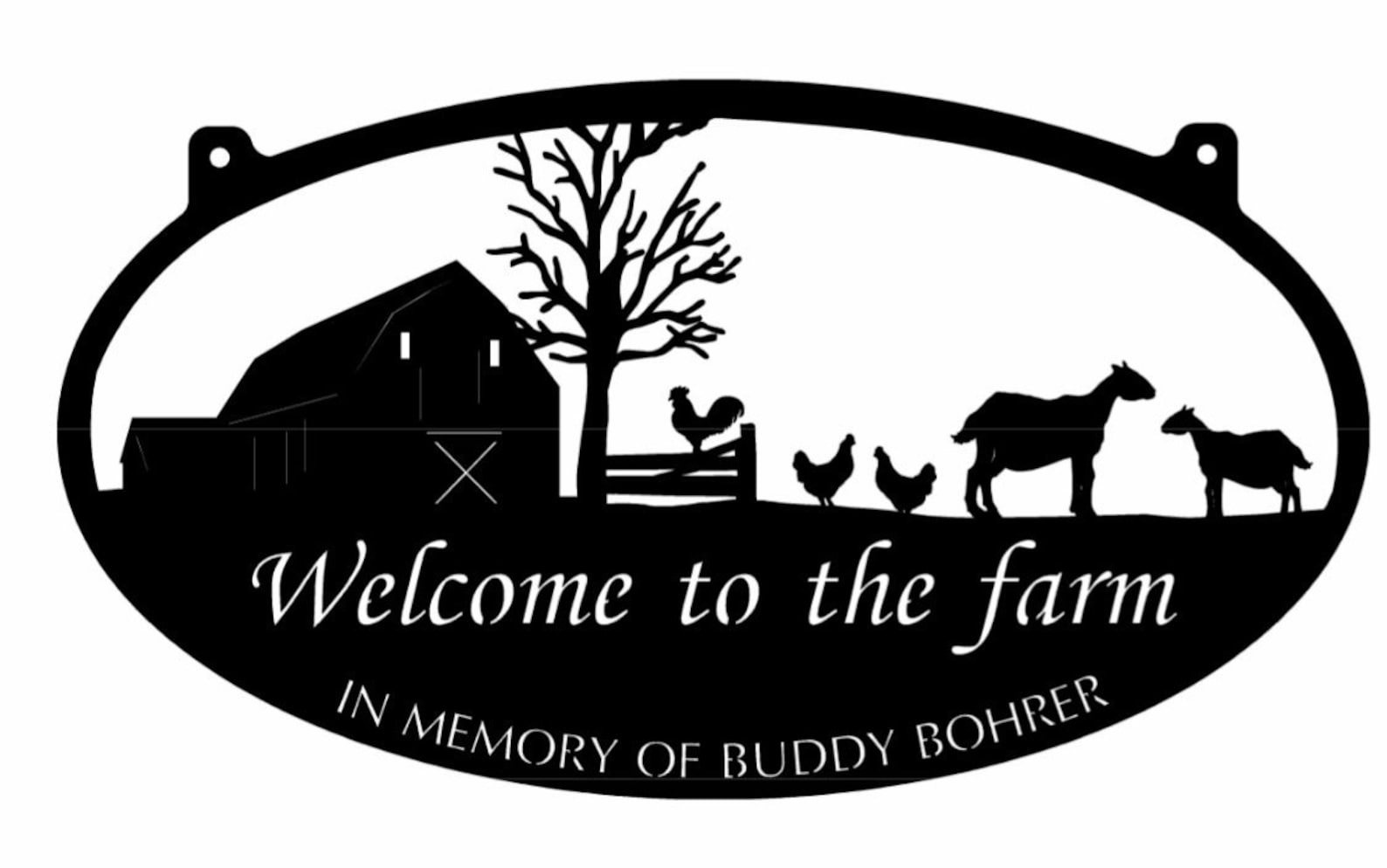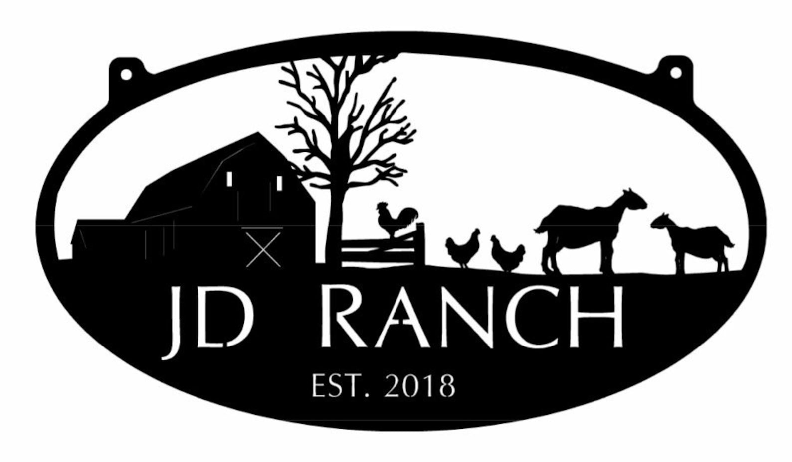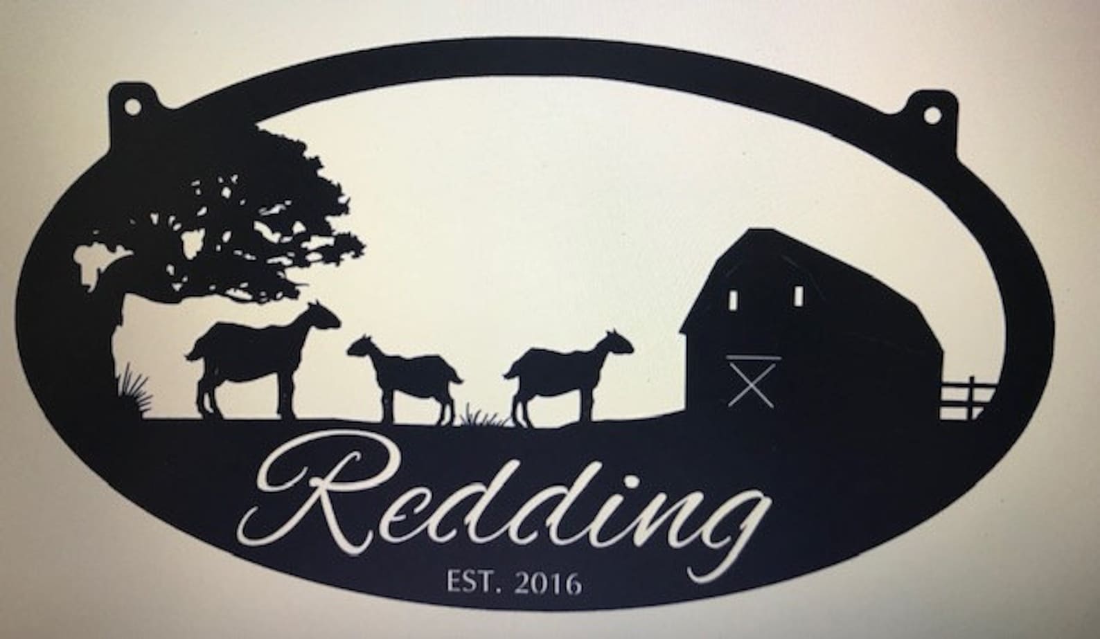 Rustic, personalized metal sign with barn and goat scene. Measures 28" x 16". Powder coated black or beautiful rustic acid finish and clear coated . Makes a very attractive entrance sign.Incl with the price is customizing with your name.Our finish is a baked on powder coat for a very long lasting durable finish.