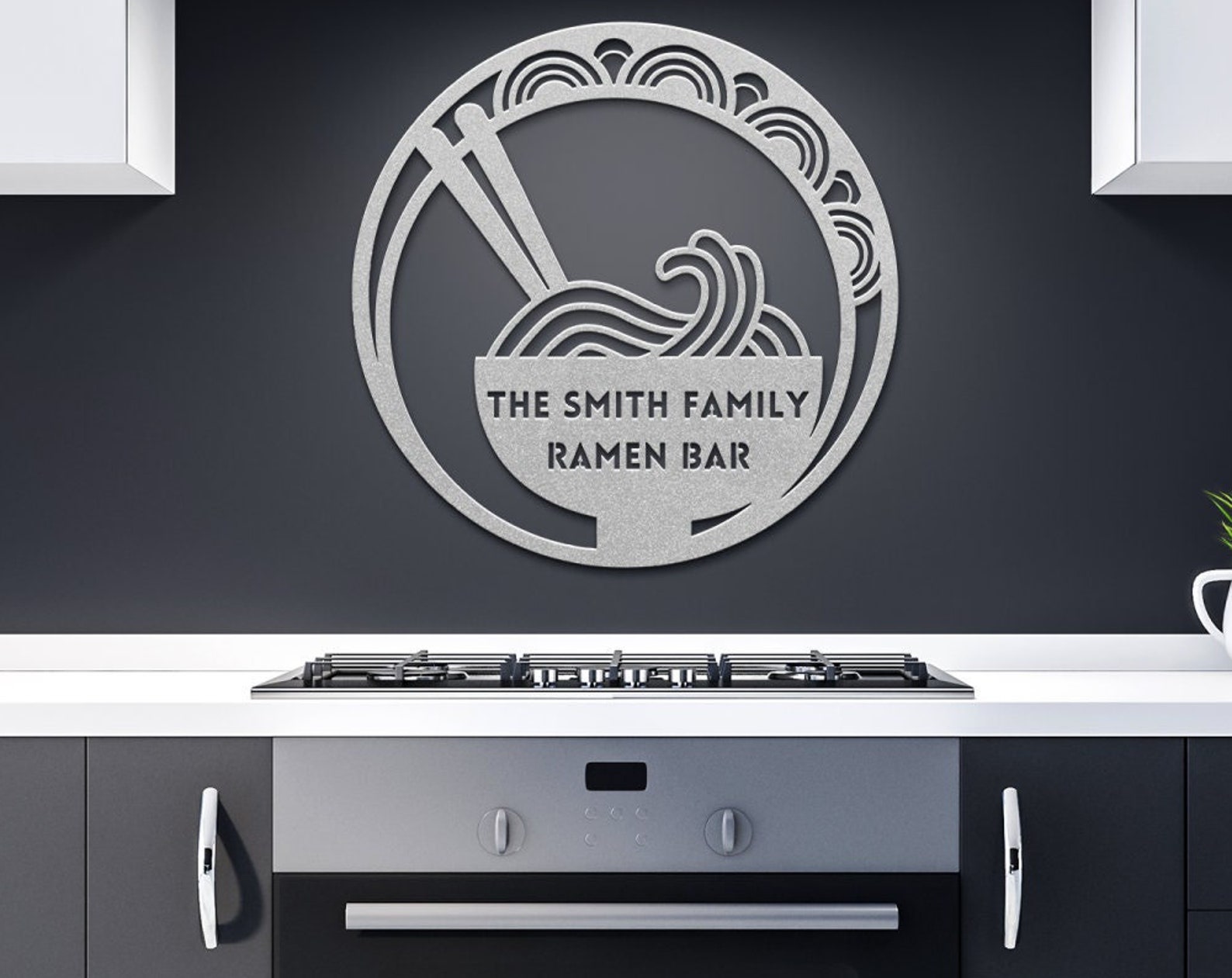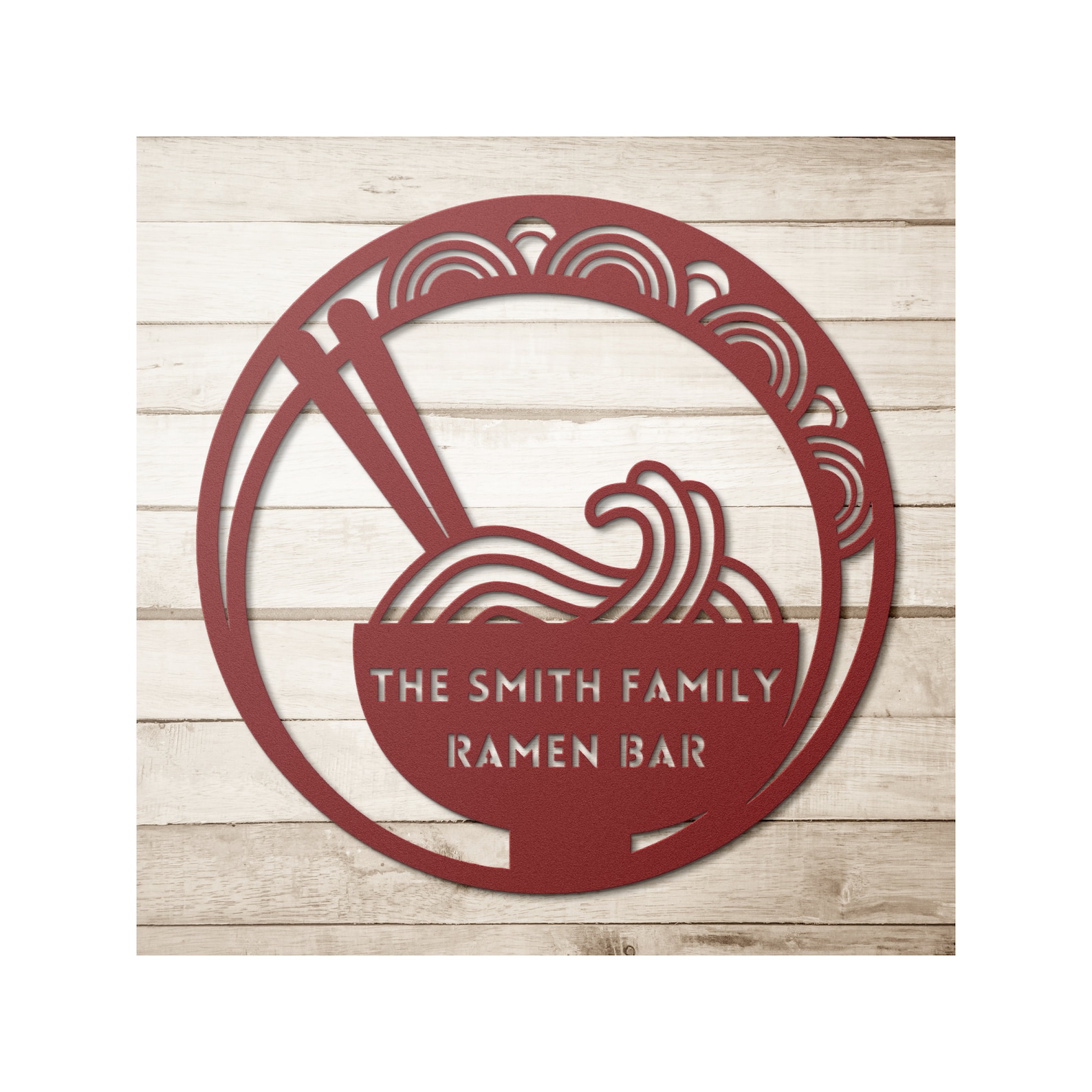 Immerse yourself in the allure of a steaming ramen bowl adorned with elegant chopsticks, nestled amidst swirling noodles within a contemporary circle-in-circle motif. Personalize it with your family name, transforming your space into the "[your name] Family Ramen Bar," a haven where exquisite taste meets personalized refinement.