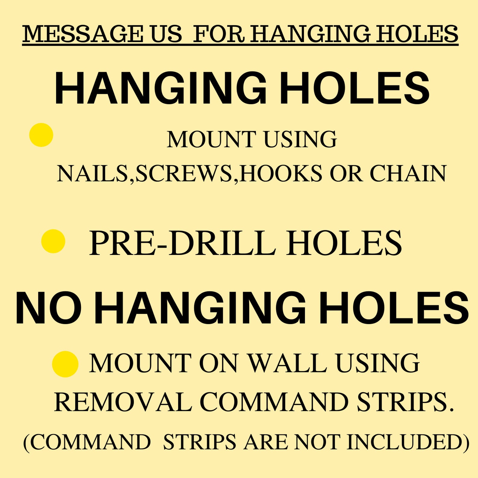 Hanging the sign from the design itself on a nail or screw is very common. Other commonly used methods to attach to a wall are removable command strips, ribbons, or rope.