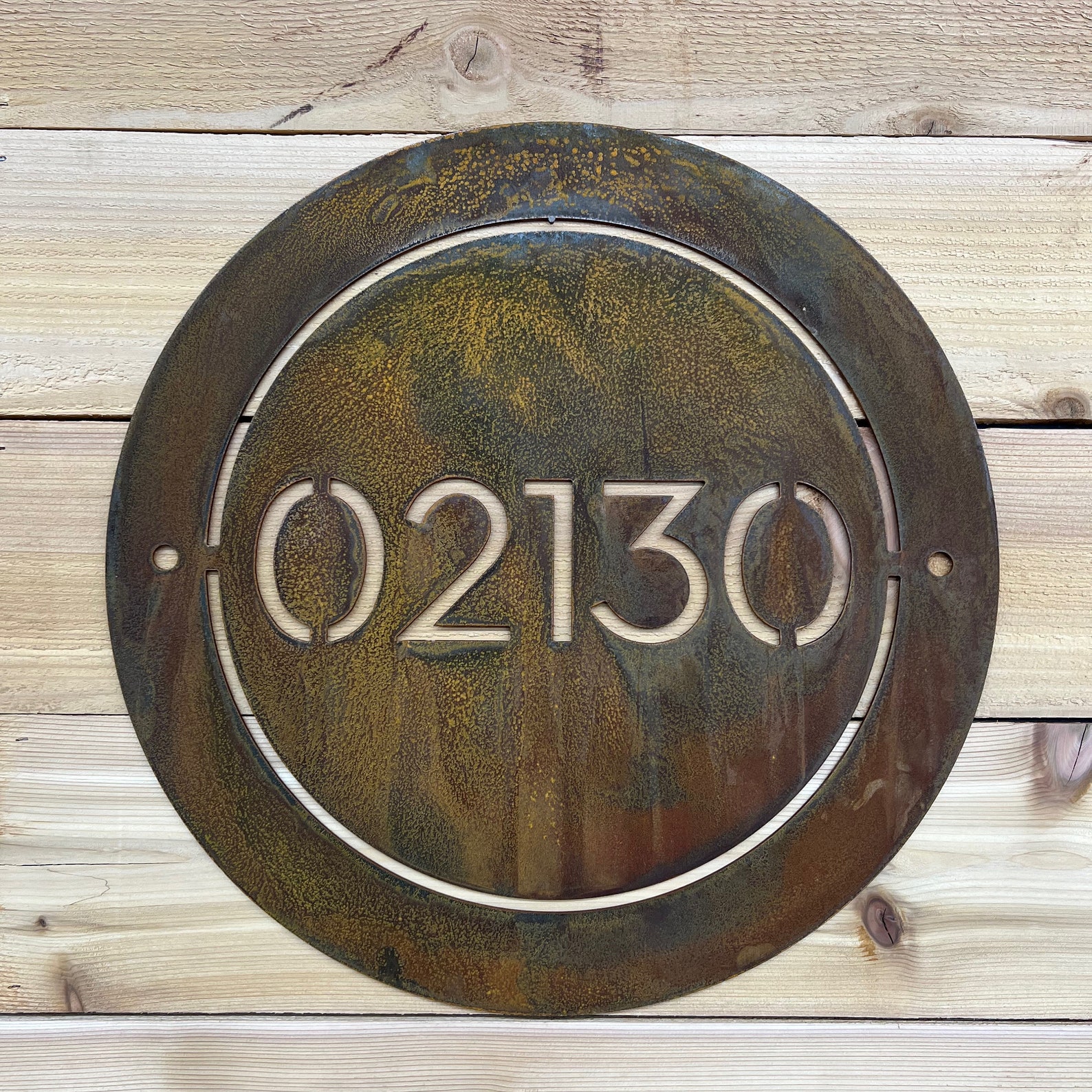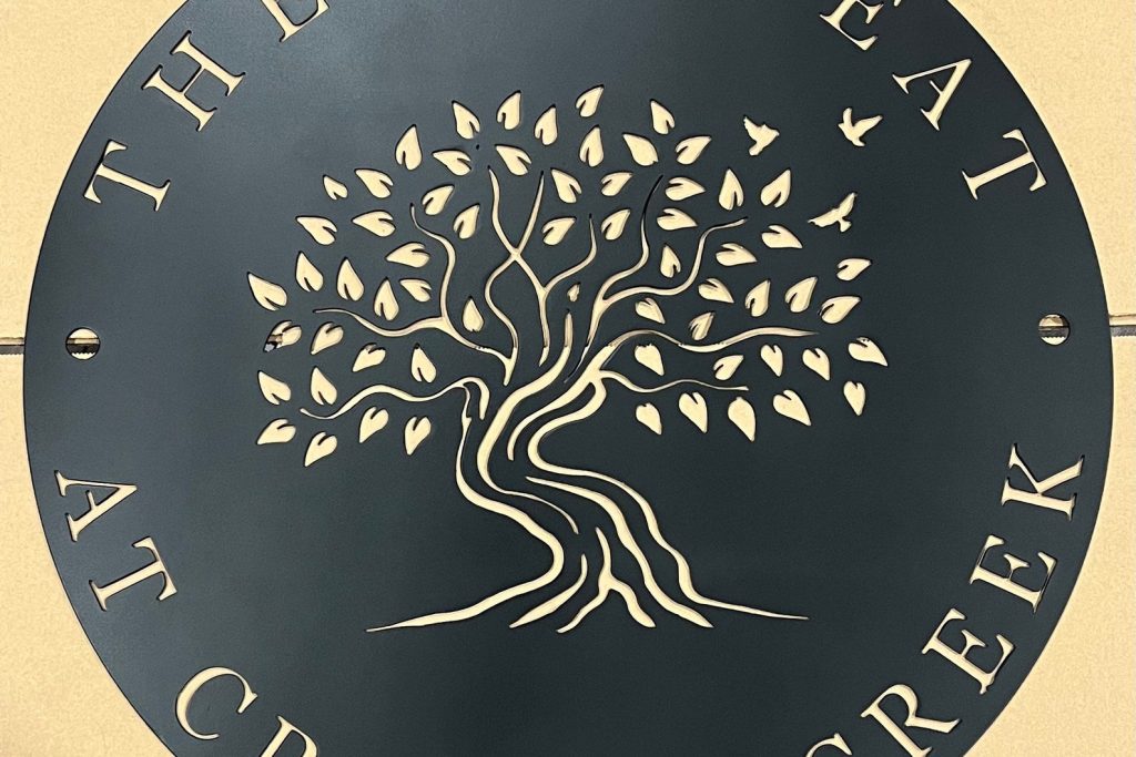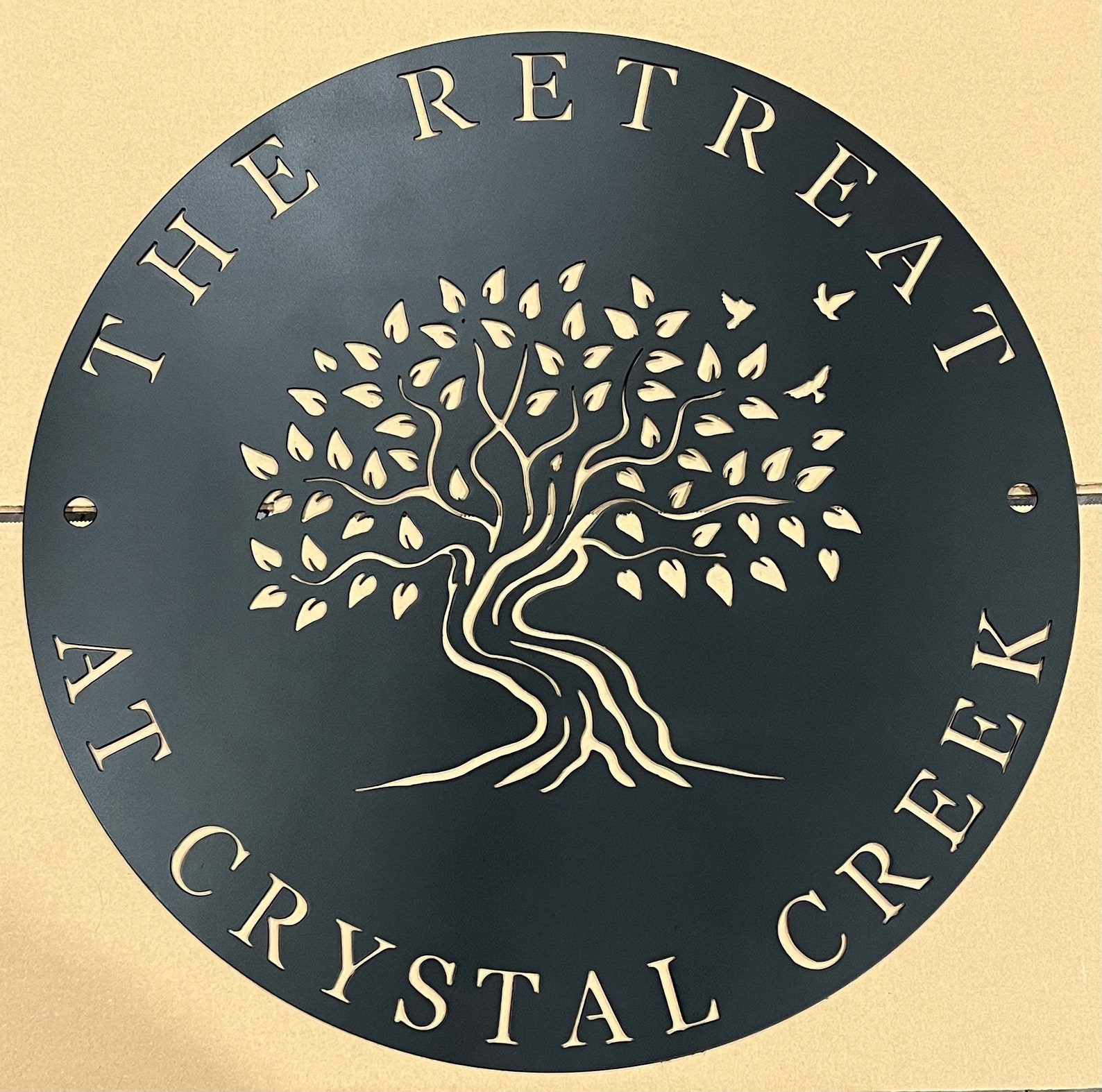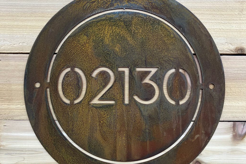 CNC plasma cut from 14-gauge steel, painted and sealed with protective clear coating for indoor/outdoor use.