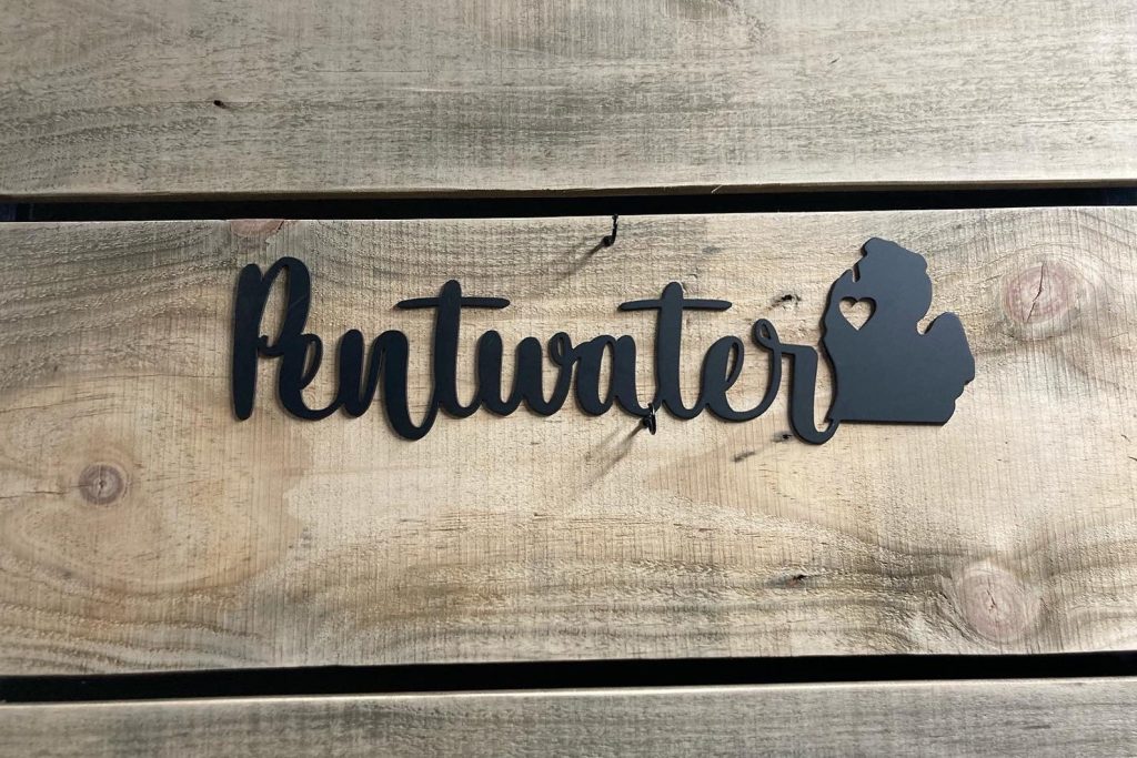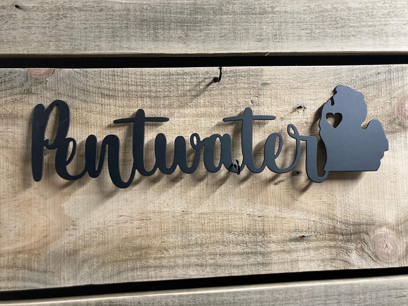 Crafted out of locally sourced Steel. Finished in a flat black powder coat. Custom colors and sizes may available, please send us a message for nore information. The Pentwater design shown measures 16 by 5. The width will vary based on city name; however, the height will be 5".