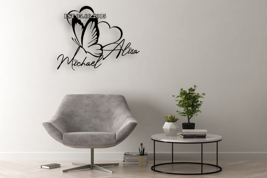 Metal Customized Names and Date Sign , Heart and Butterfly, Custom Metal Wall Art, Home Decoration, Wedding, New Home ,Housewarming Gift