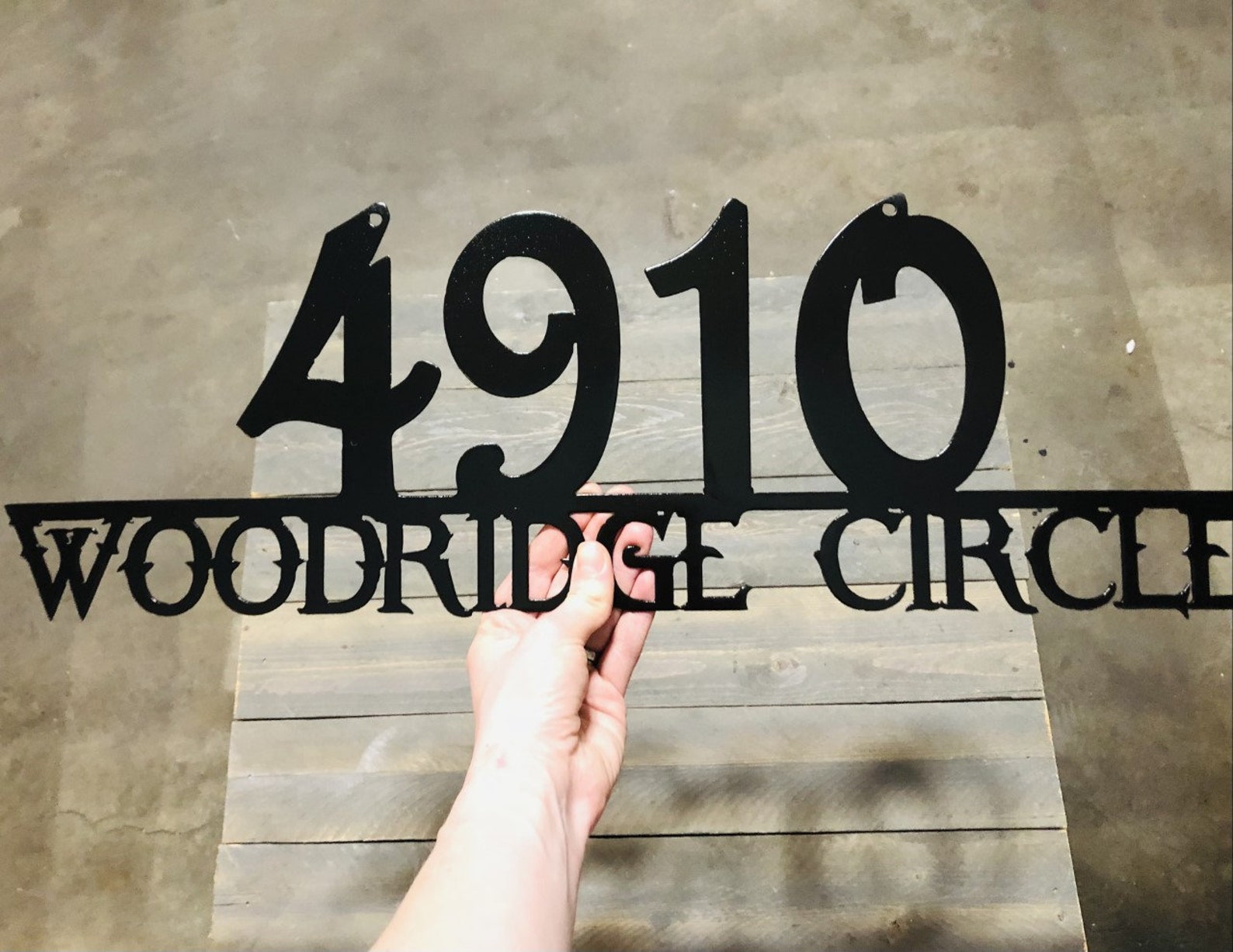 23 wide, a classy way to display your address number and street name. Two holes cut for either hanging with screws or on hooks. Durable. Painted black or grained silver and clear coated for protection.