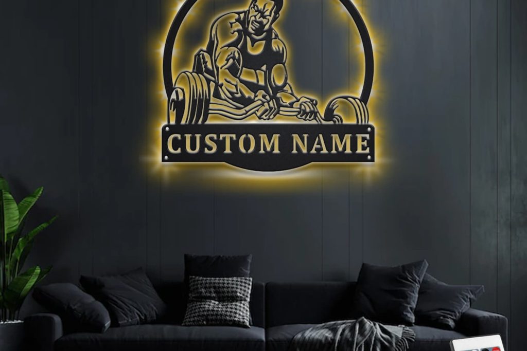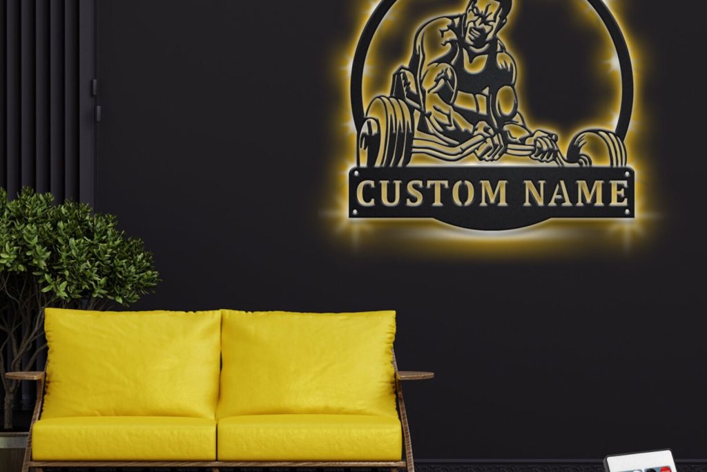 Custom Powerlifting Man Metal Sign with LED – Room Decor