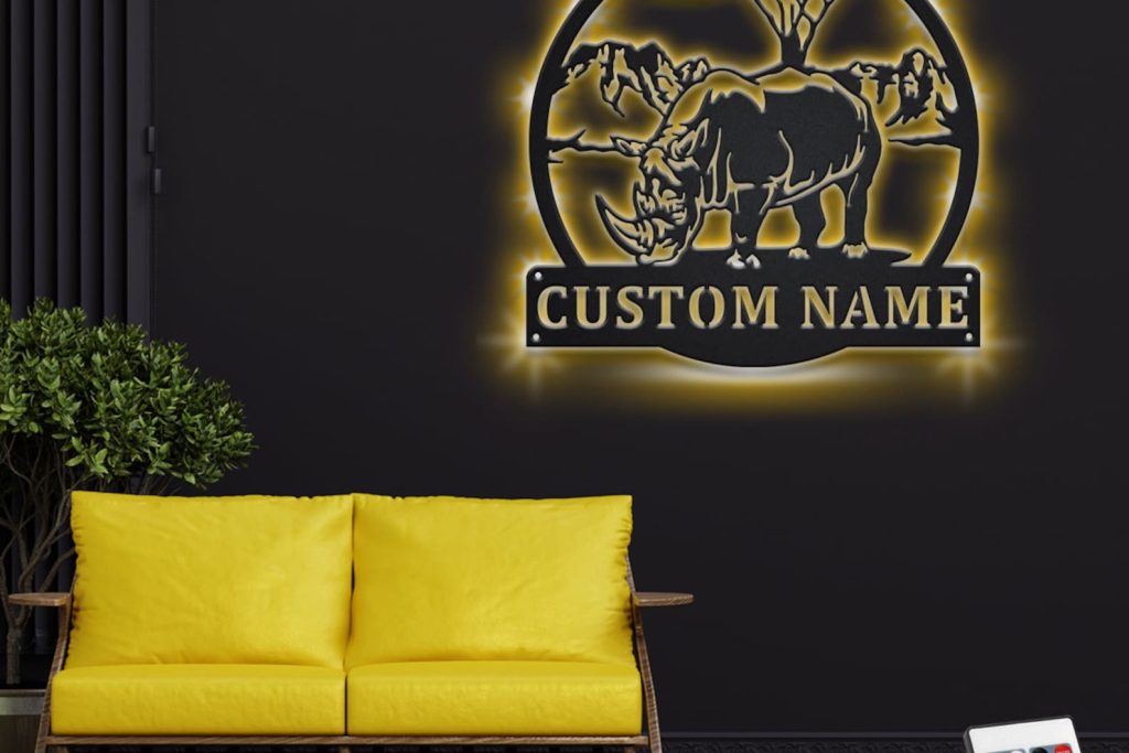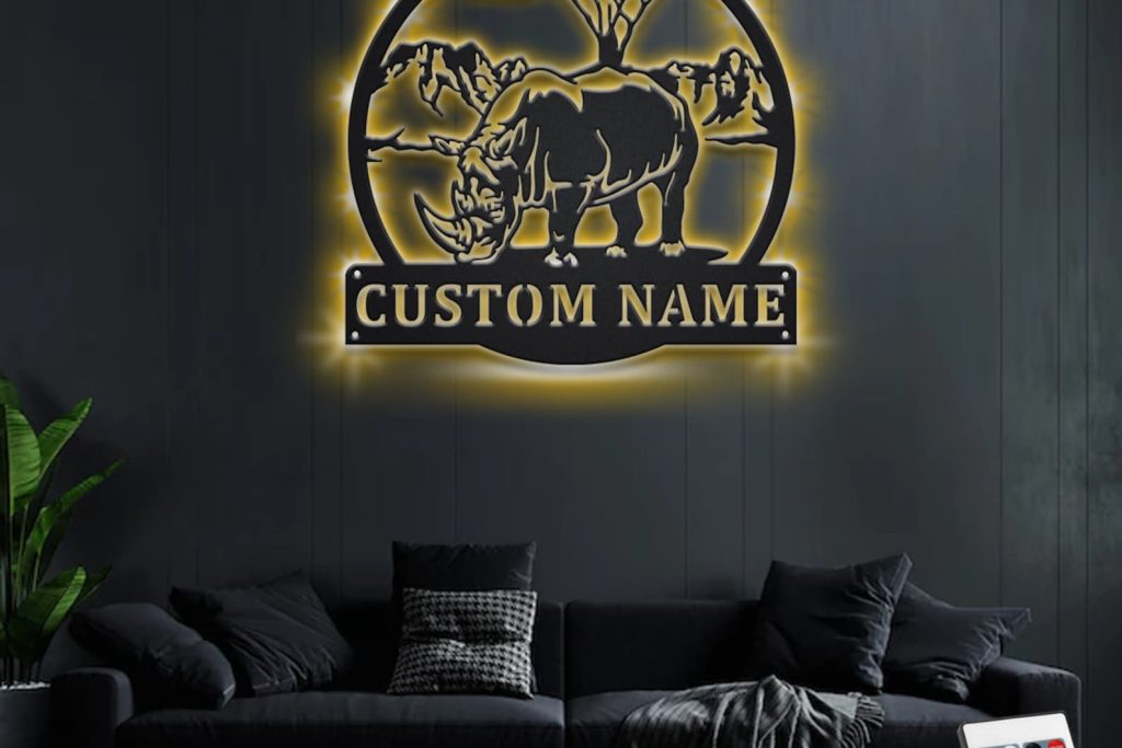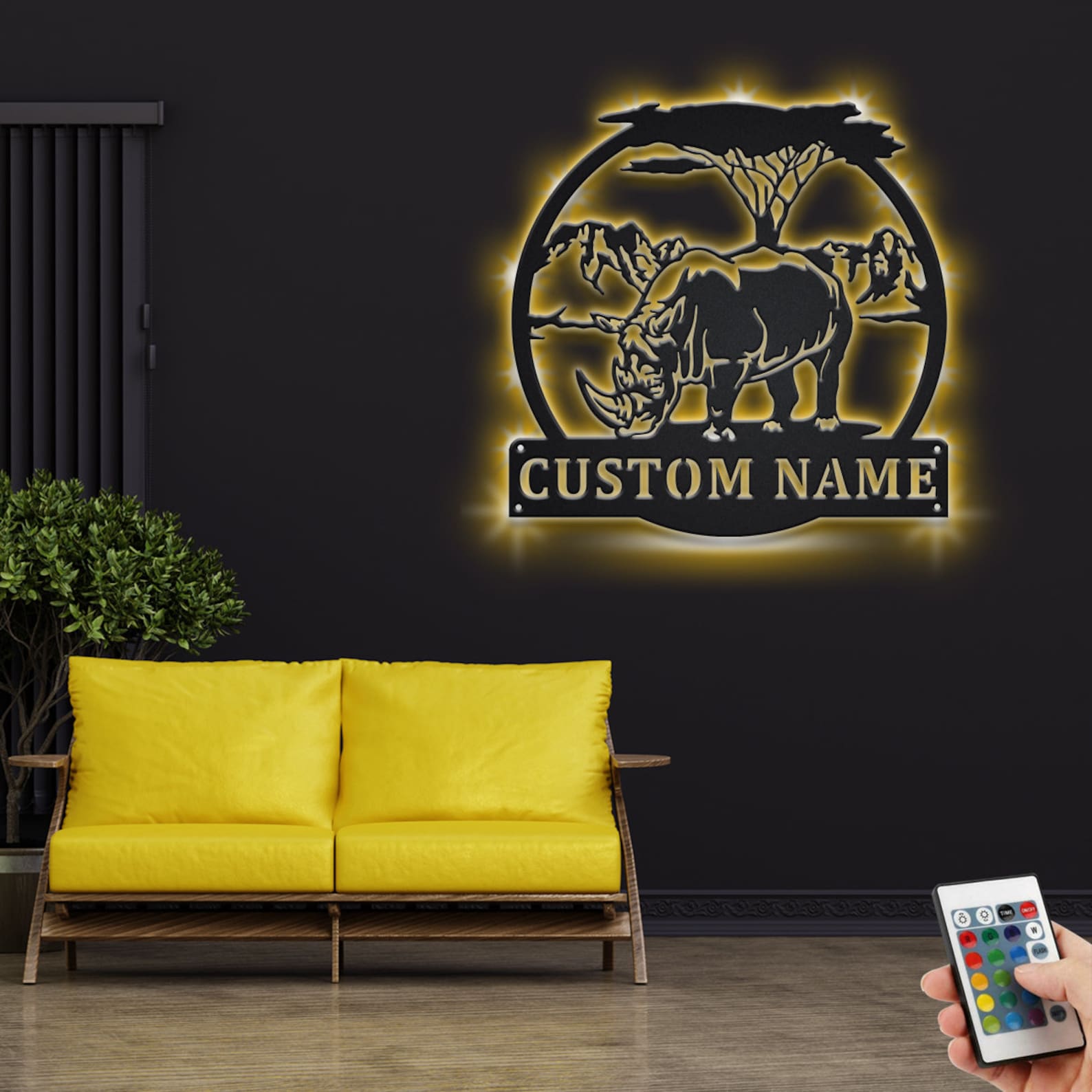 Custom Rhinoceros Metal Wall Art – LED Light, Personalized Decor