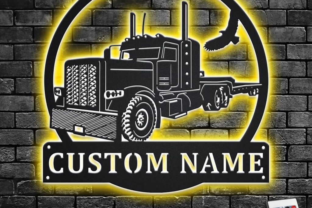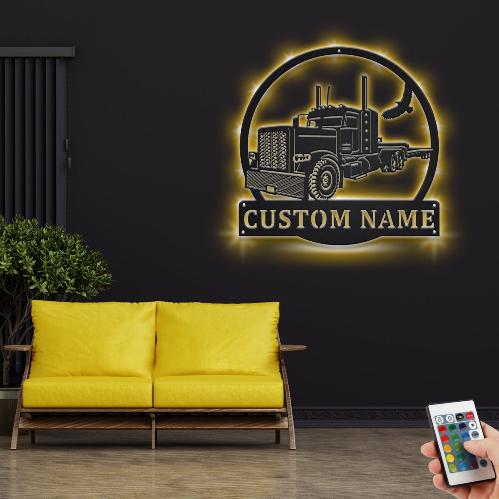 Custom Semi Truck Metal Wall Art with LED Light, Personalized Name Sign