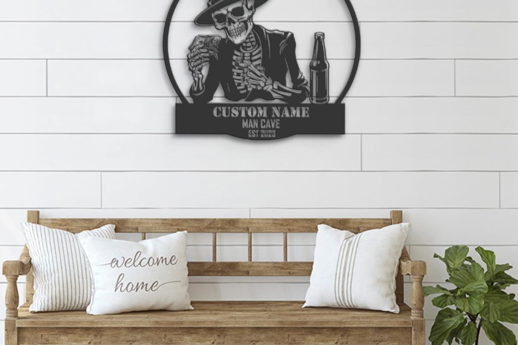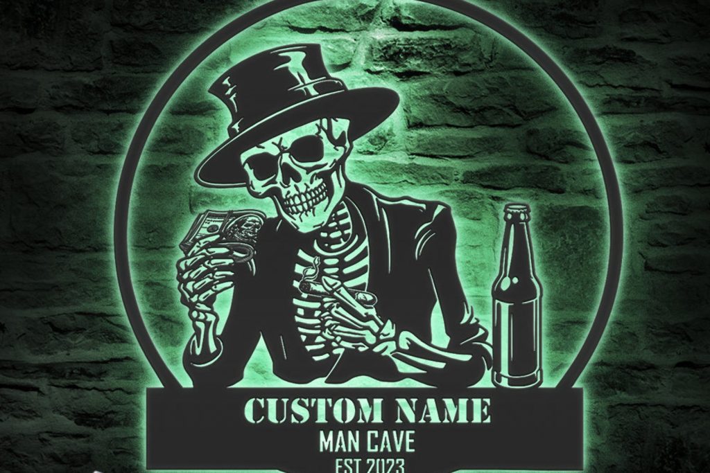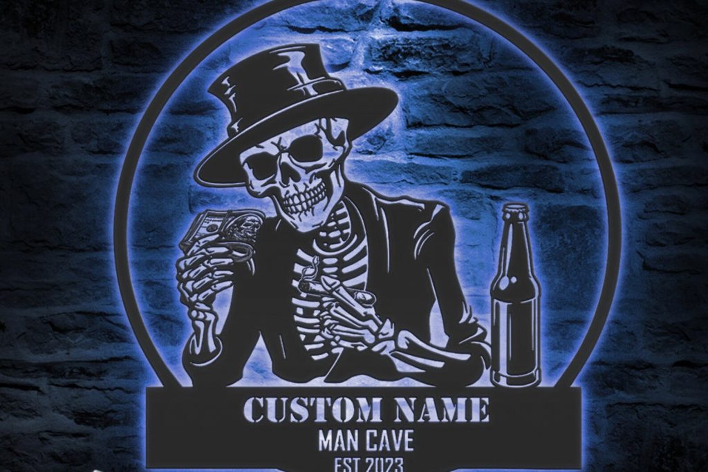 Be the first to review “Custom Skeleton Beer Cigar Dollars Metal Wall Art – LED Light, Personalized Sign”