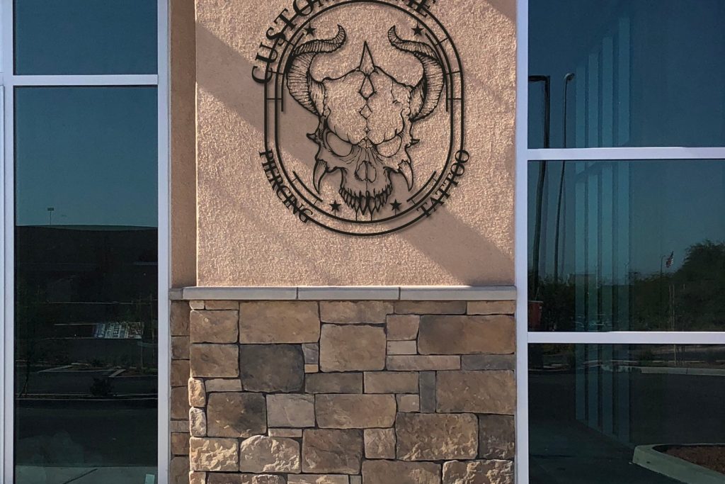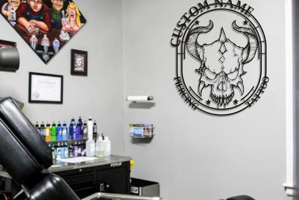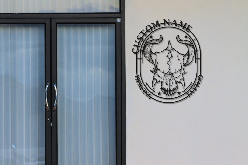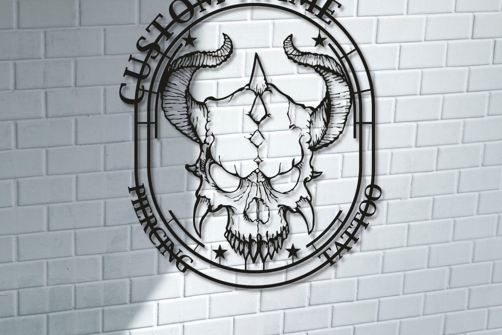 A skull themed metal tattoo wall decor with devil detail underneath. It is suitable for writing your brand name on the upper part, describing the business area with Tattoo and piercing writings on the lower part. If you want a different design, just contact us.