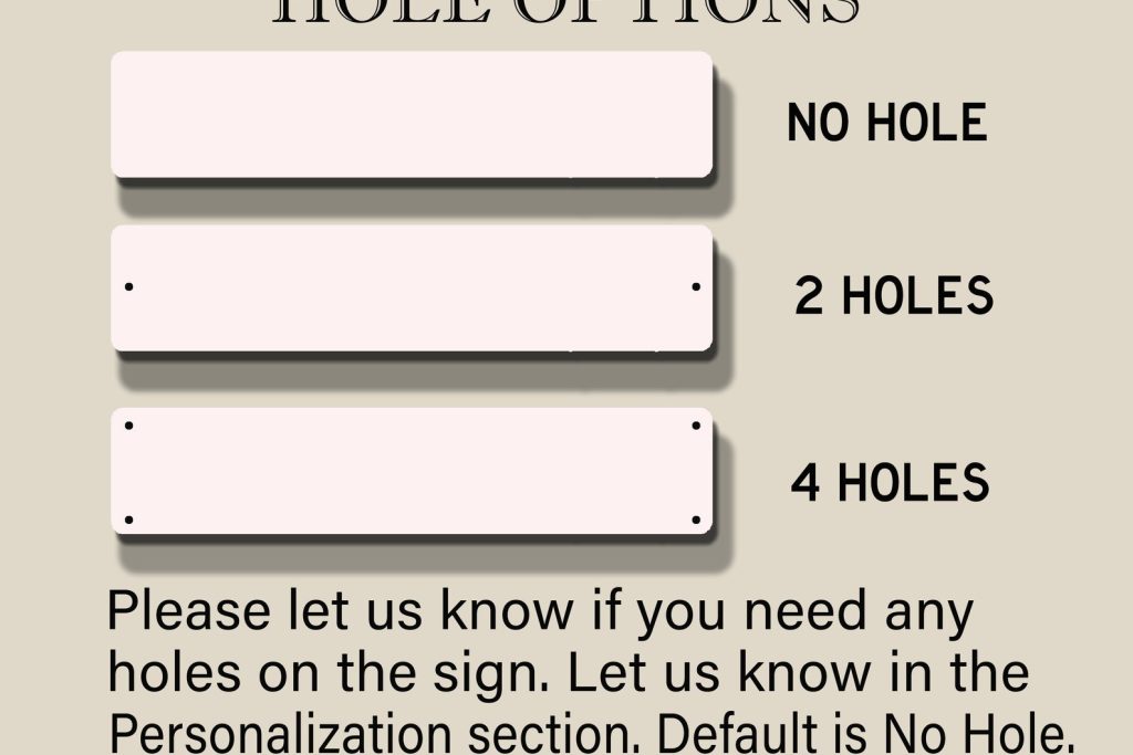 3.tSpecify if you need any holes to be drilled into the sign. Available options: No hole, 2 holes, 4 holes. If you do not specify, we will ship it without any holes drilled.