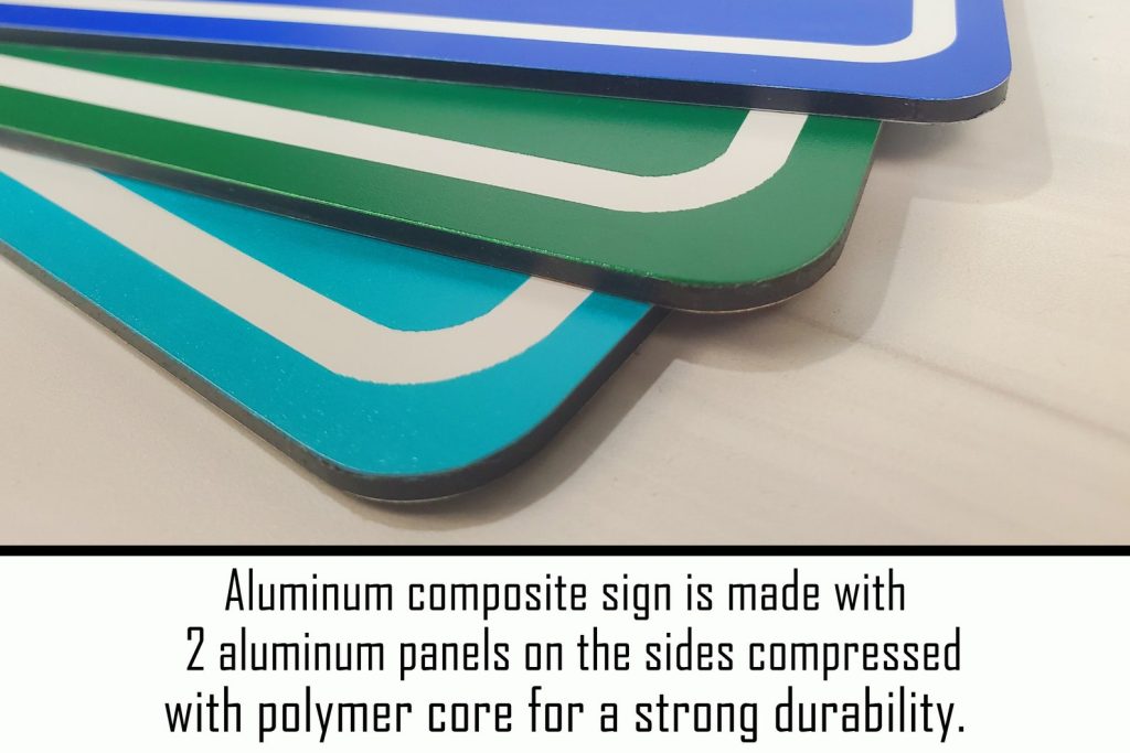 The aluminum composite panel is 1/8 inch thick. It is comprised of a reinforced synthetic core sandwiched between two sheets of aluminum. This combination is more rigid yet lightweight, making it easy to hang. This sign will not rust. This product is not a decal.