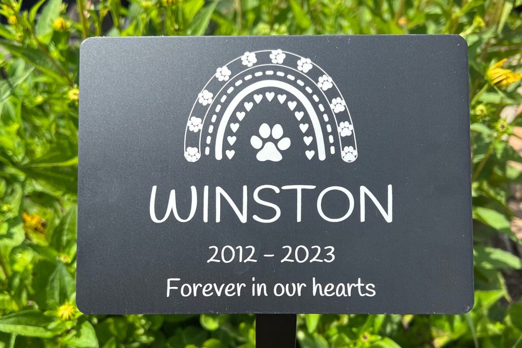 7"L x 5"H- Engraved black metal plaque and stake. Engraved with rainbow design shown. Add your custom name, date and quote.