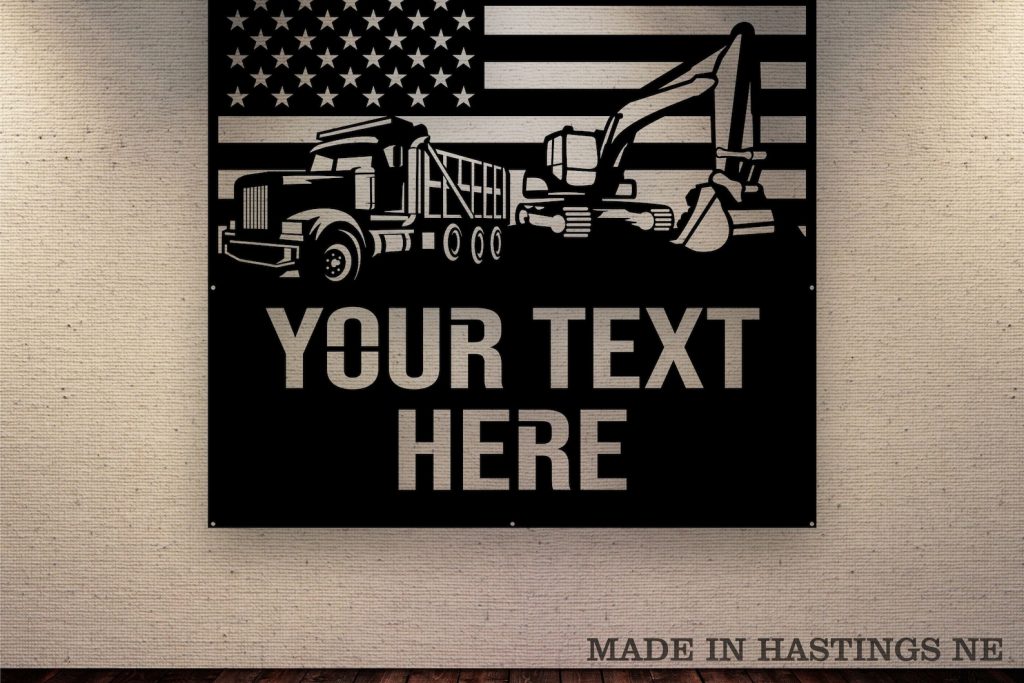 Excavator Dump Truck Metal Sign with Flag