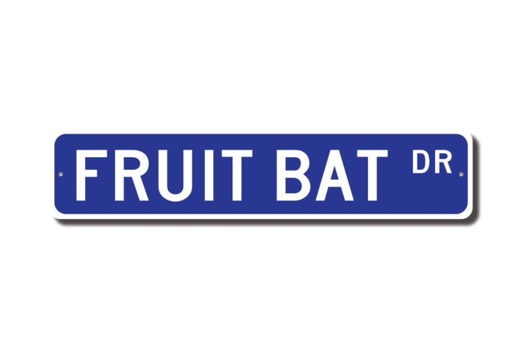 Fruit Bat lovers check out this awesome street sign! This will make the perfect piece for any Fruit Bat lover, or maybe you are a Fruit Bat fan looking for a cool decor piece. Made of premium aluminum it will stand the test of time. This sign will look great in any room, home den, cave, or office! Get this sign for your favorite Fruit Bat aficionado !