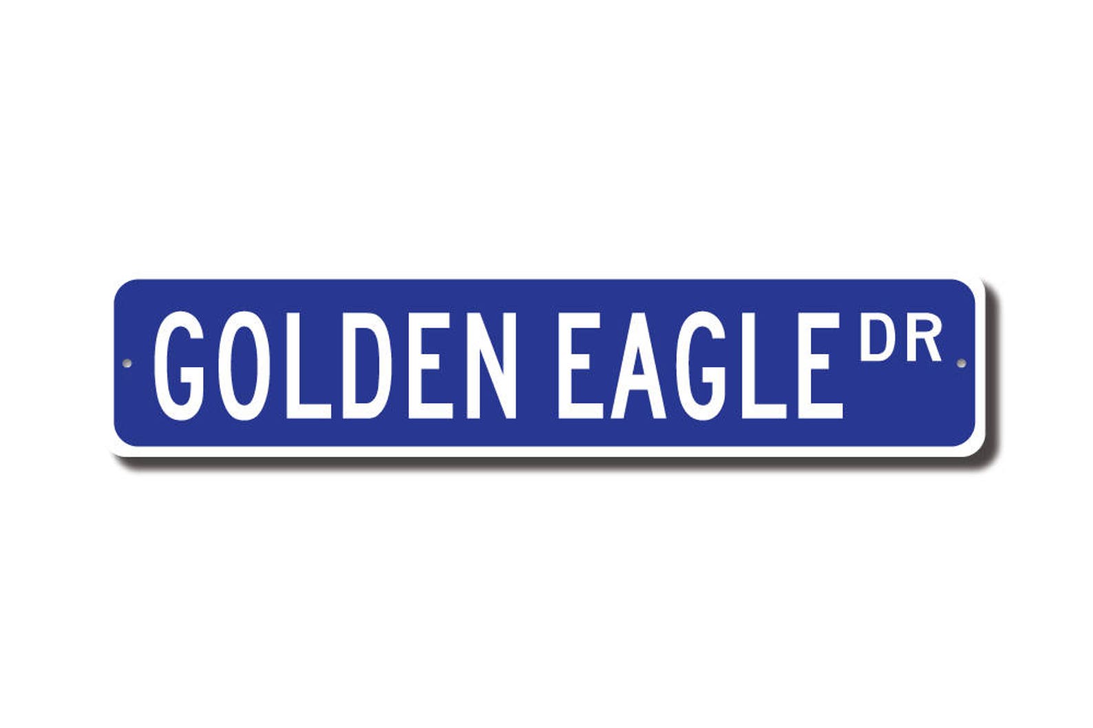 Golden Eagle lovers check out this awesome street sign! This will make the perfect piece for any Golden Eagle lover, or maybe you are a Golden Eagle fan looking for a cool decor piece. Made of premium aluminum it will stand the test of time. This sign will look great in any room, home den, cave, or office! Get this sign for your favorite Golden Eagle aficionado !