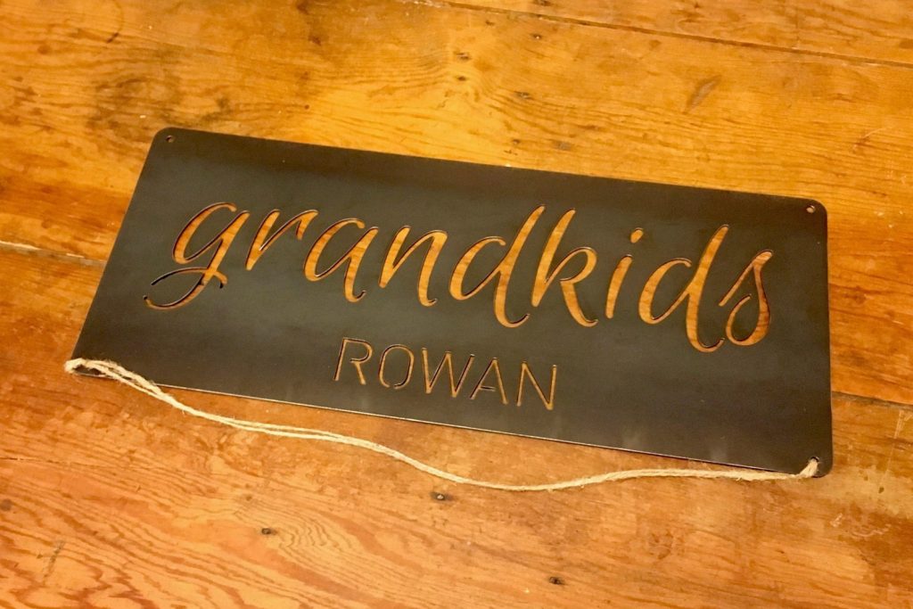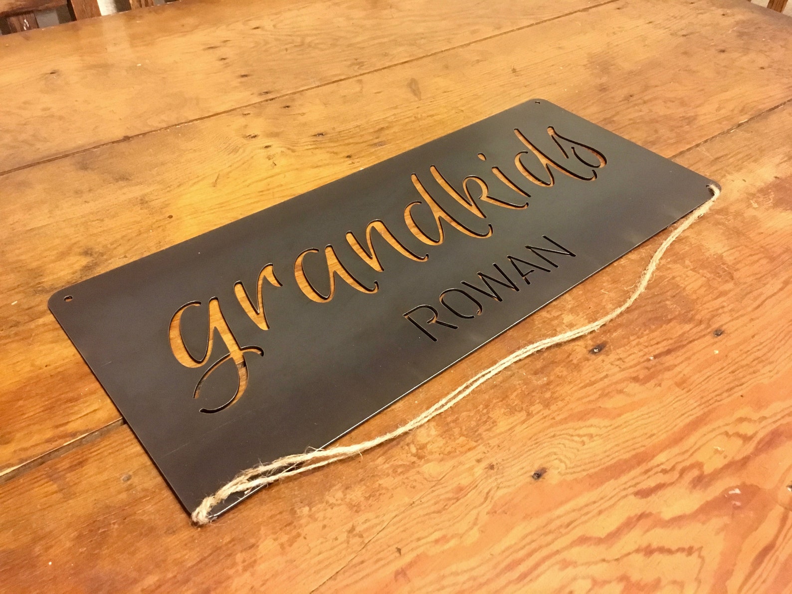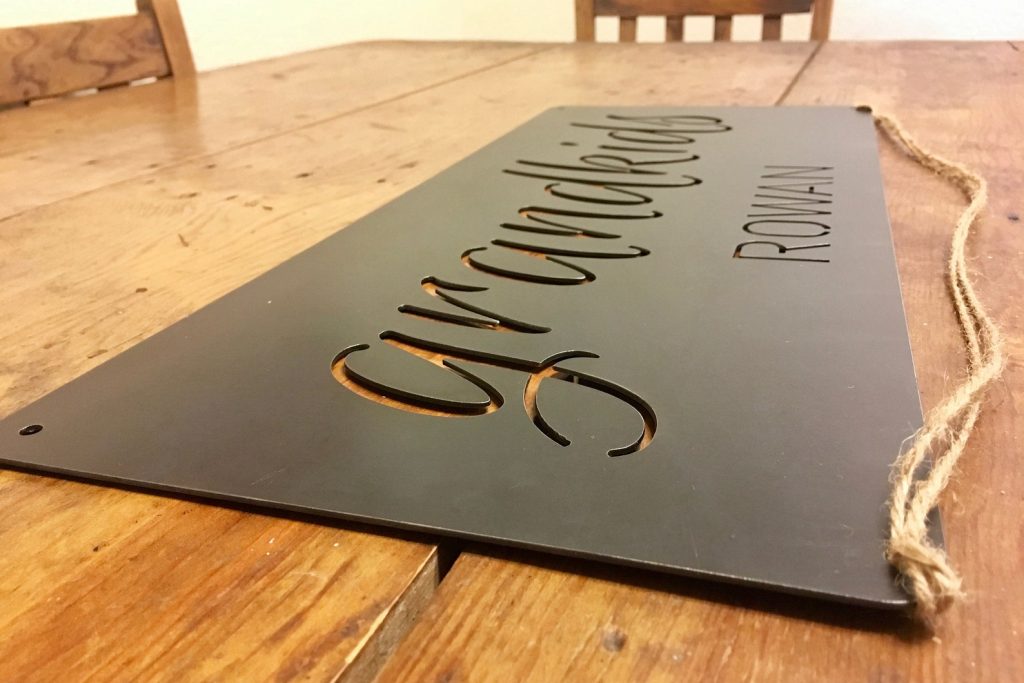 This unique metal sign is customized and used to hang pictures of grandkids and family. We use a plasma-cutting CNC table to create this piece, customized to your preferences. We tie twine along the bottom for you to pin your photos (mini clothes-pins are the best!).