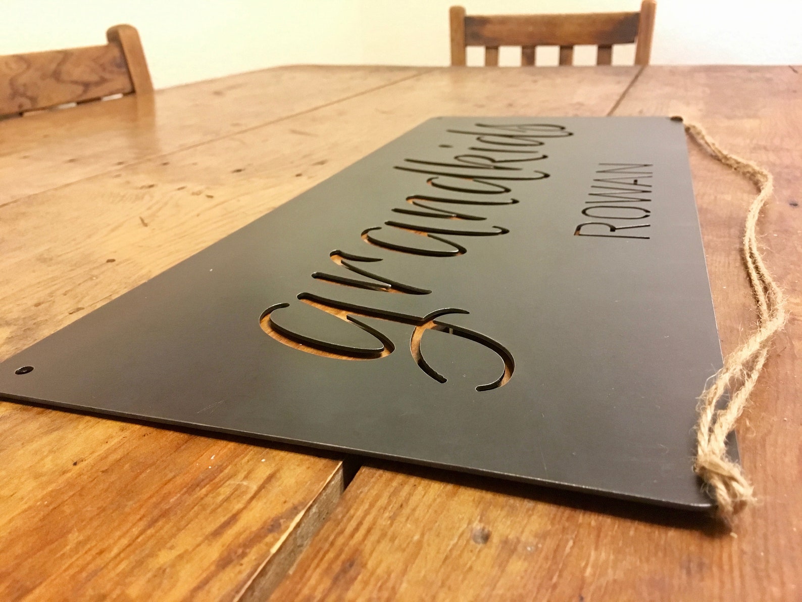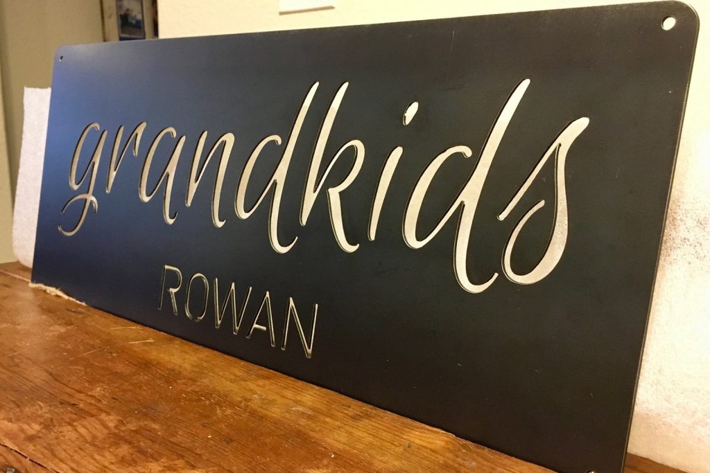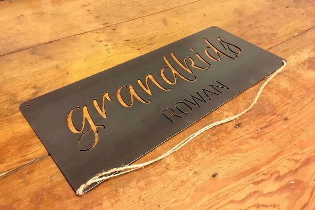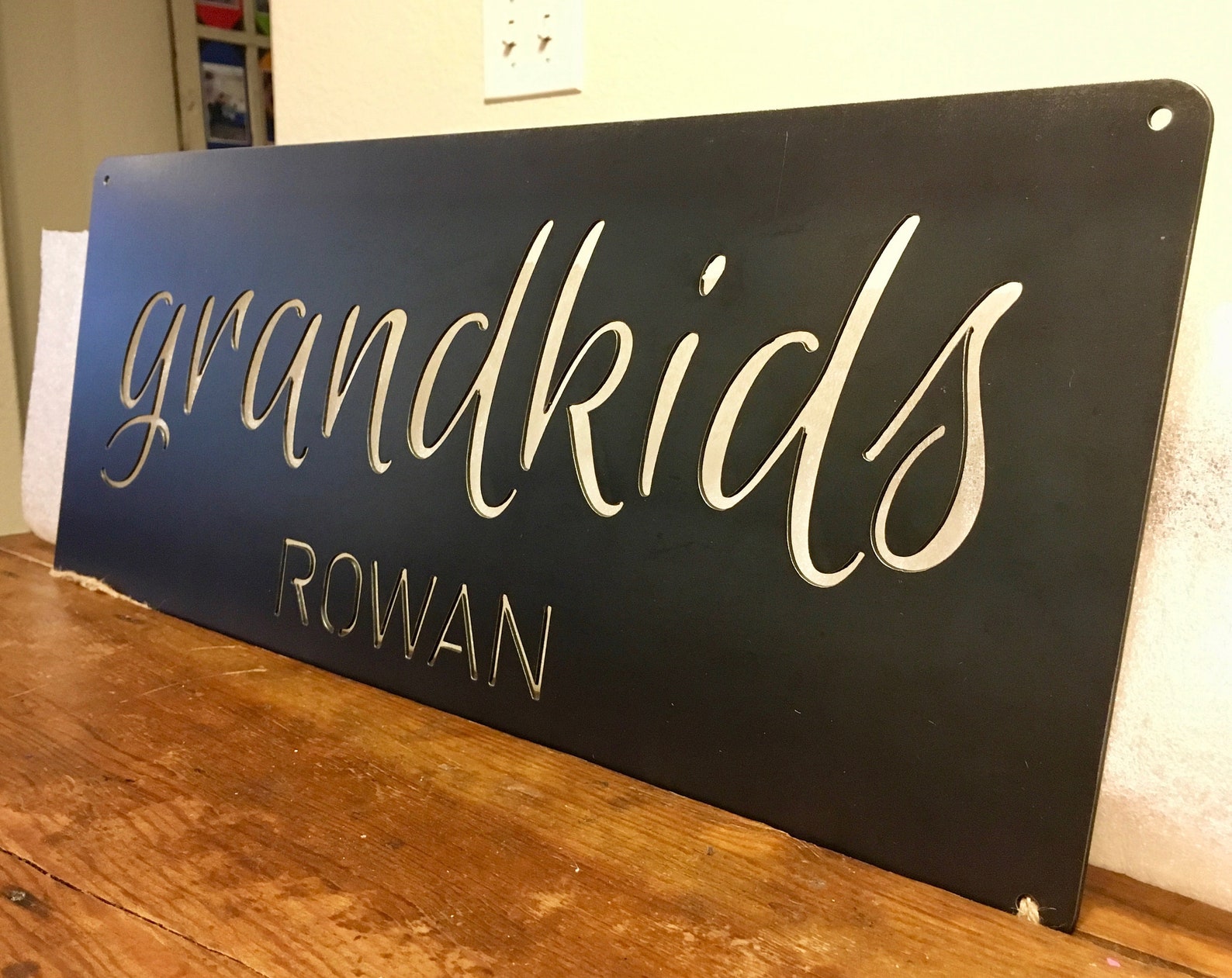This unique metal sign is customized and used to hang pictures of grandkids and family. We use a plasma-cutting CNC table to create this piece, customized to your preferences. We tie twine along the bottom for you to pin your photos (mini clothes-pins are the best!).