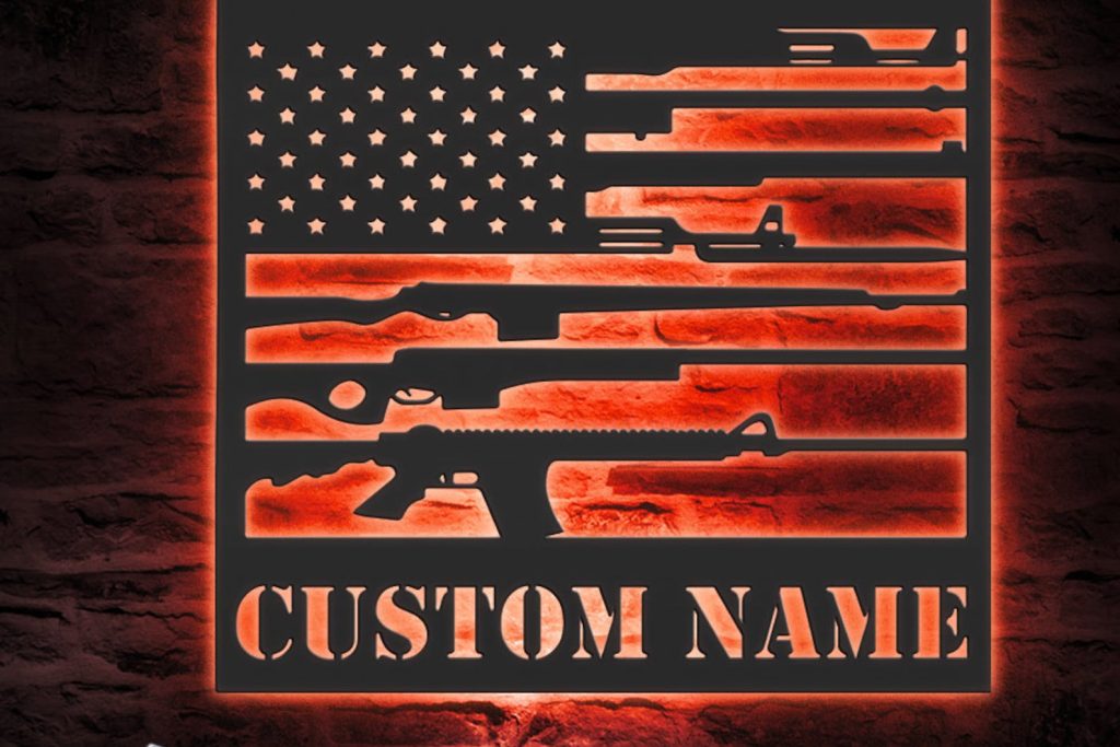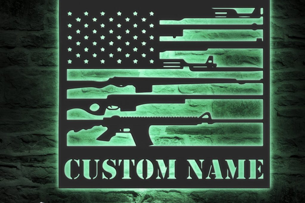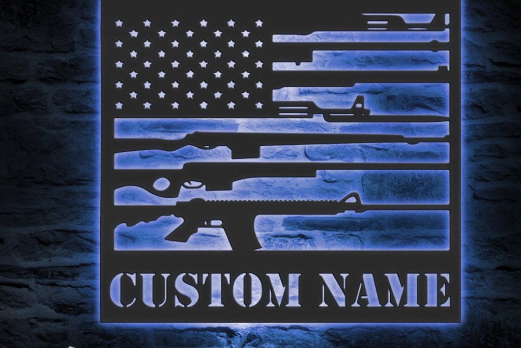 Be the first to review “Gun Flag Art – Personalized Metal LED 2nd Amendment Wall Sign”
