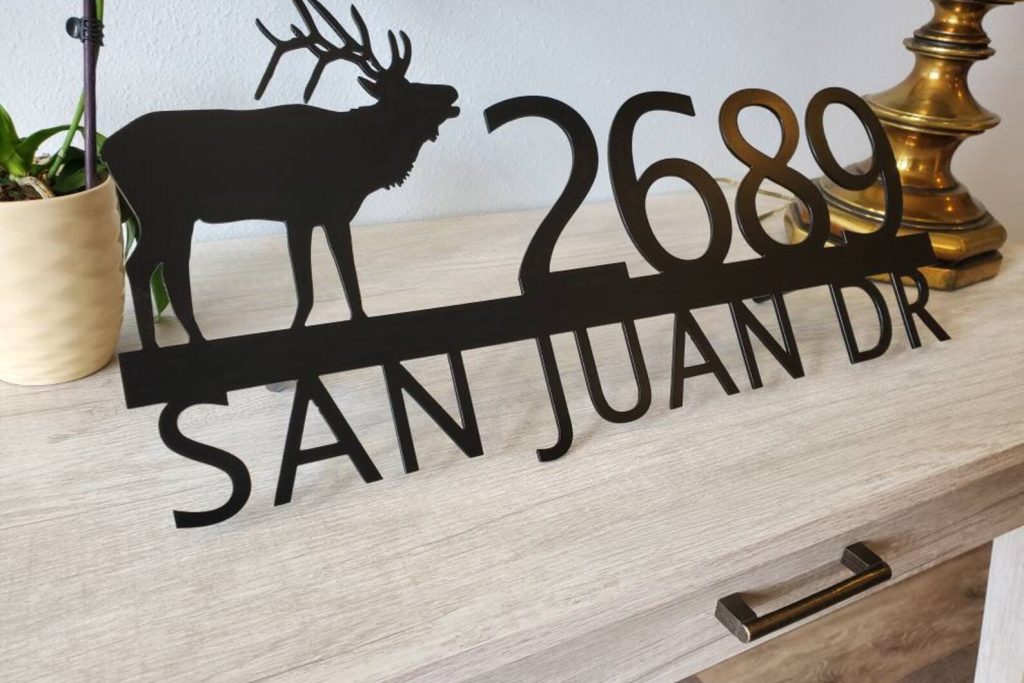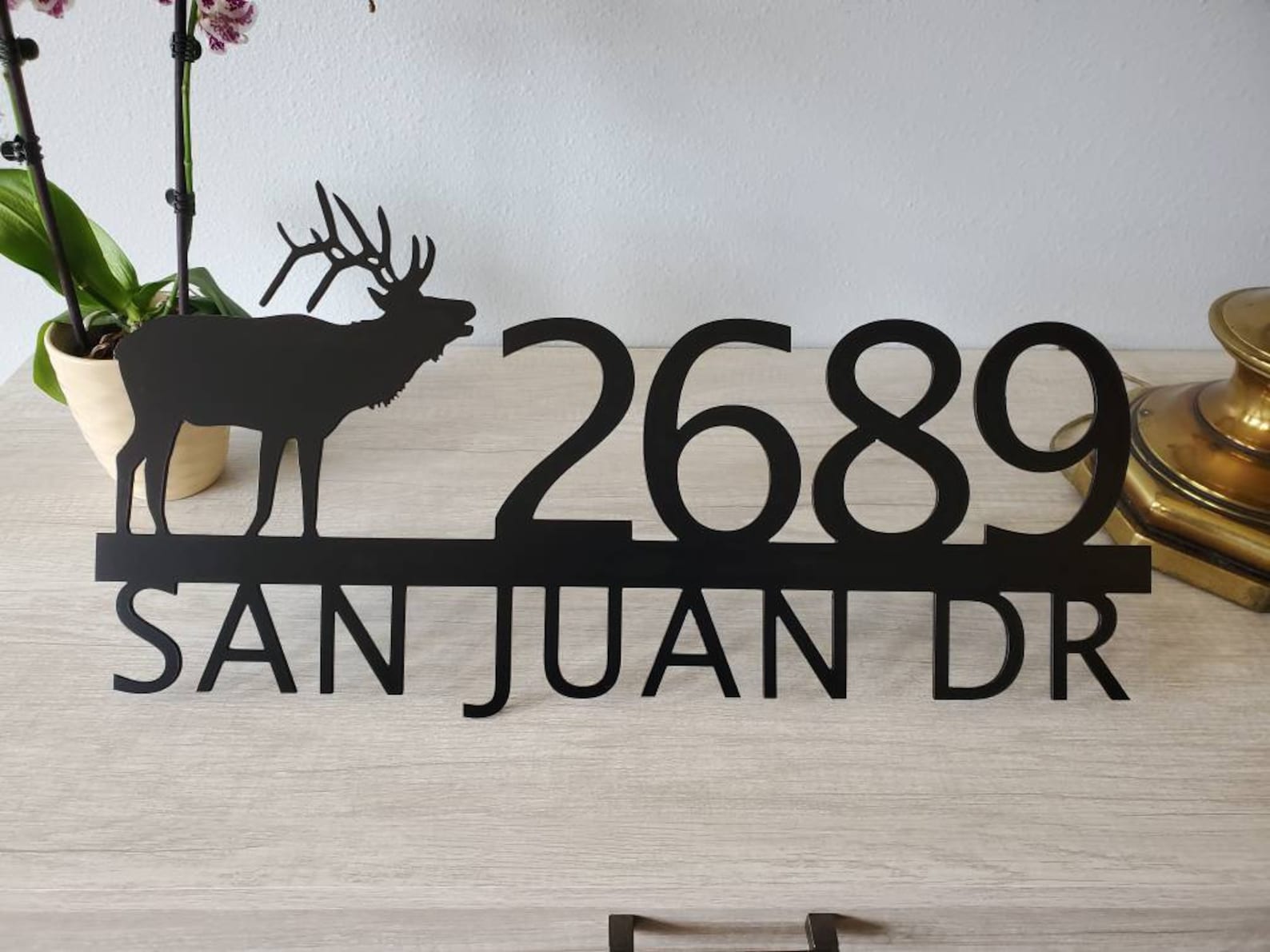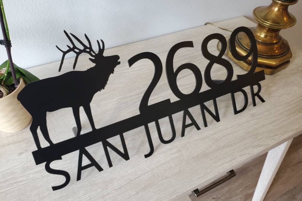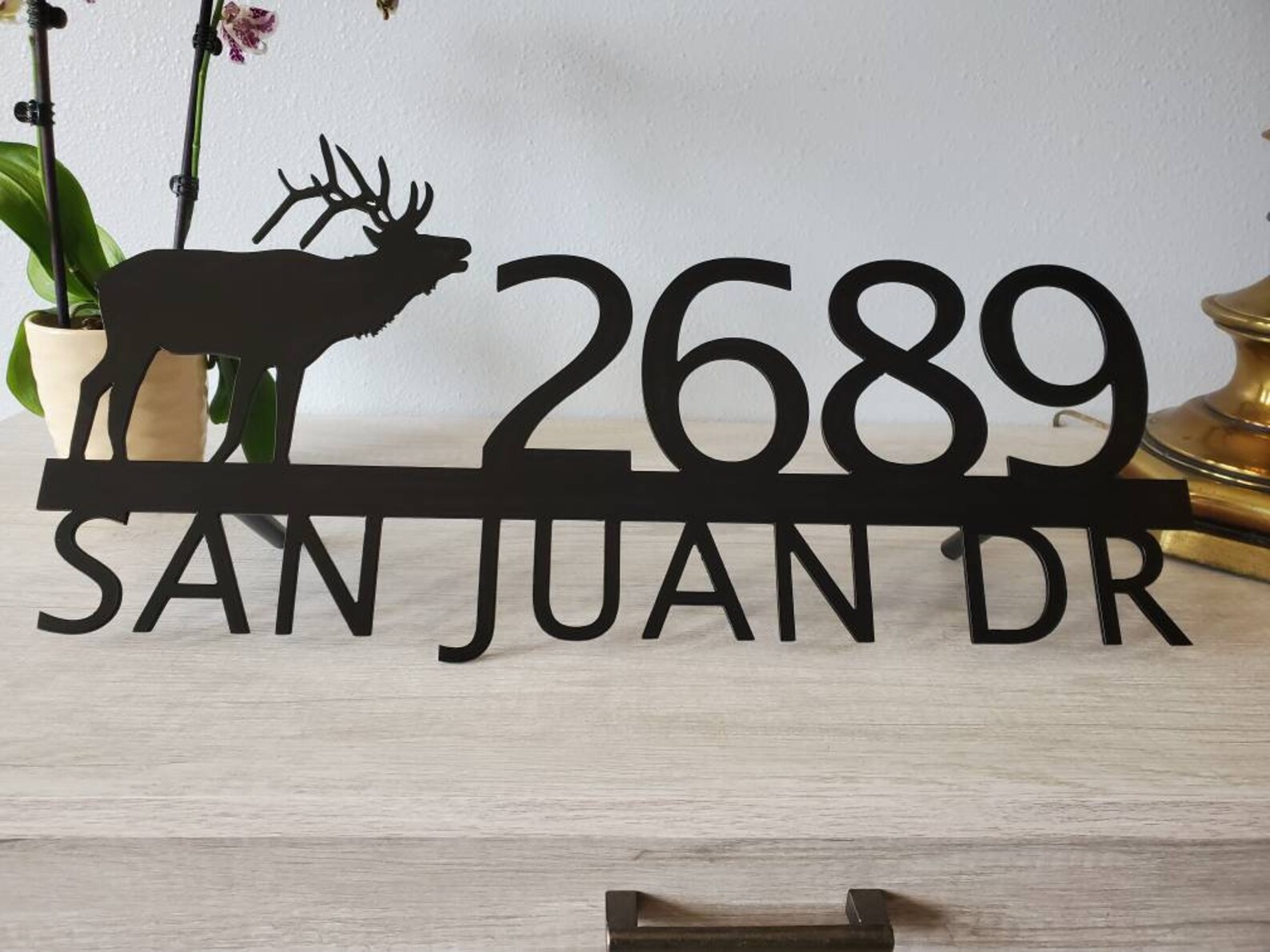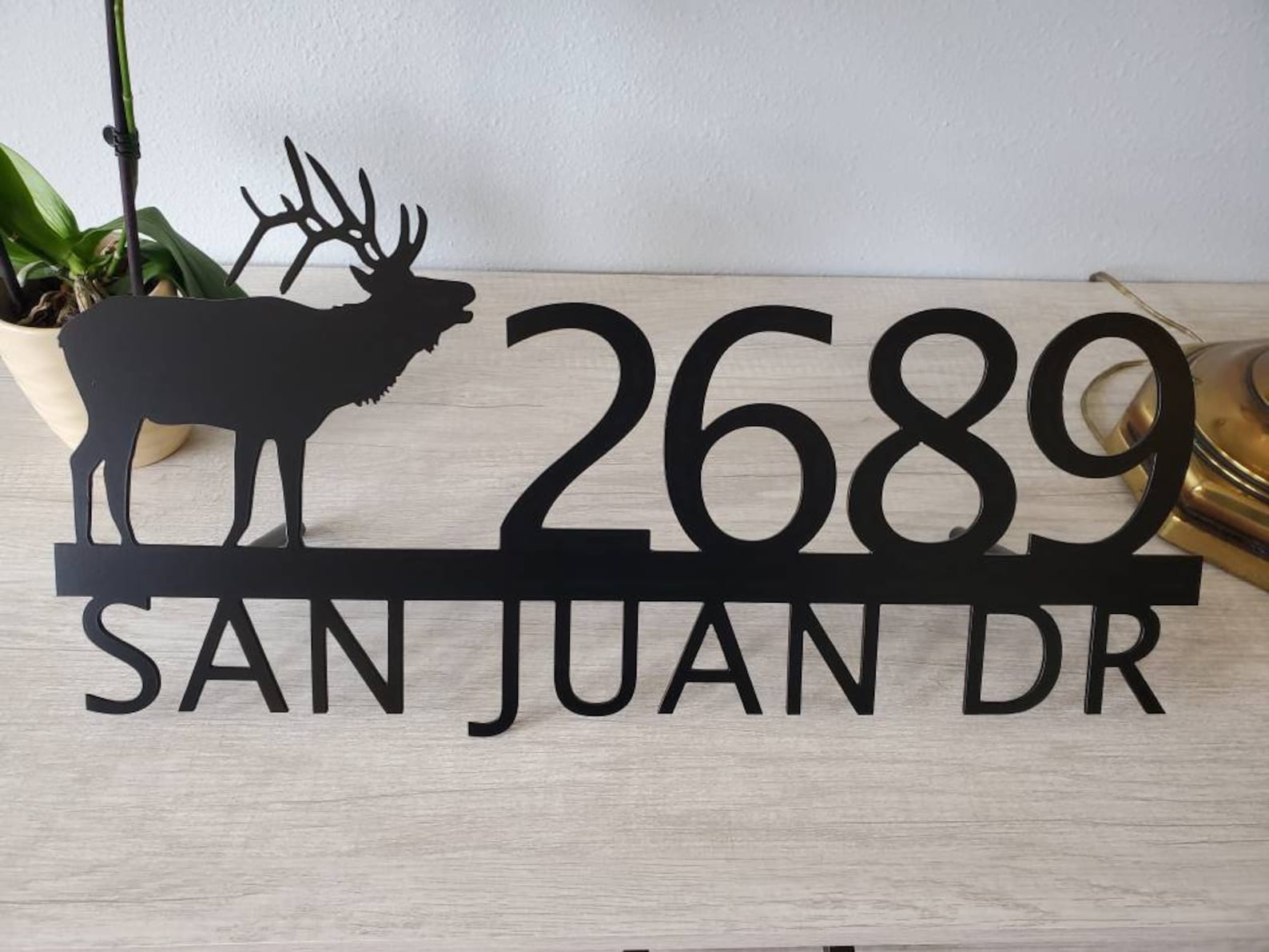 Custom metal personalized modern home house address sign, house numbers, plaque for your rock or wall with ELK design. Finished with highly durable exterior matte black powder coating. This address sign is made out of highly quality durable/sturdy 1/8 inch thick steel(12gauge). This gives the item a very sturdy feel. We do not use cheap thin metal.