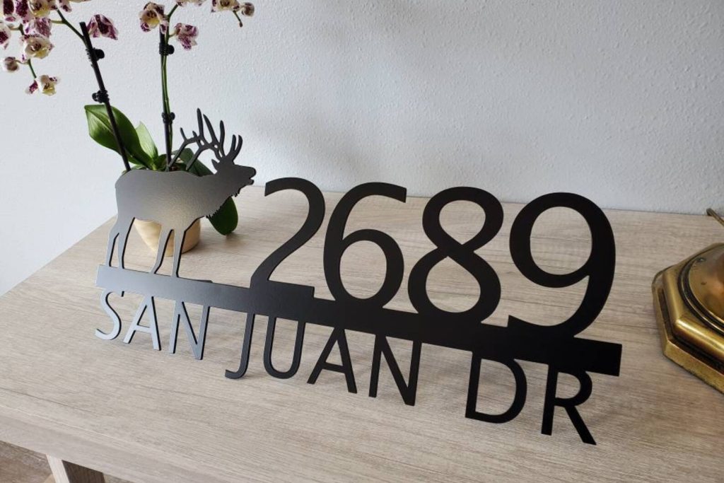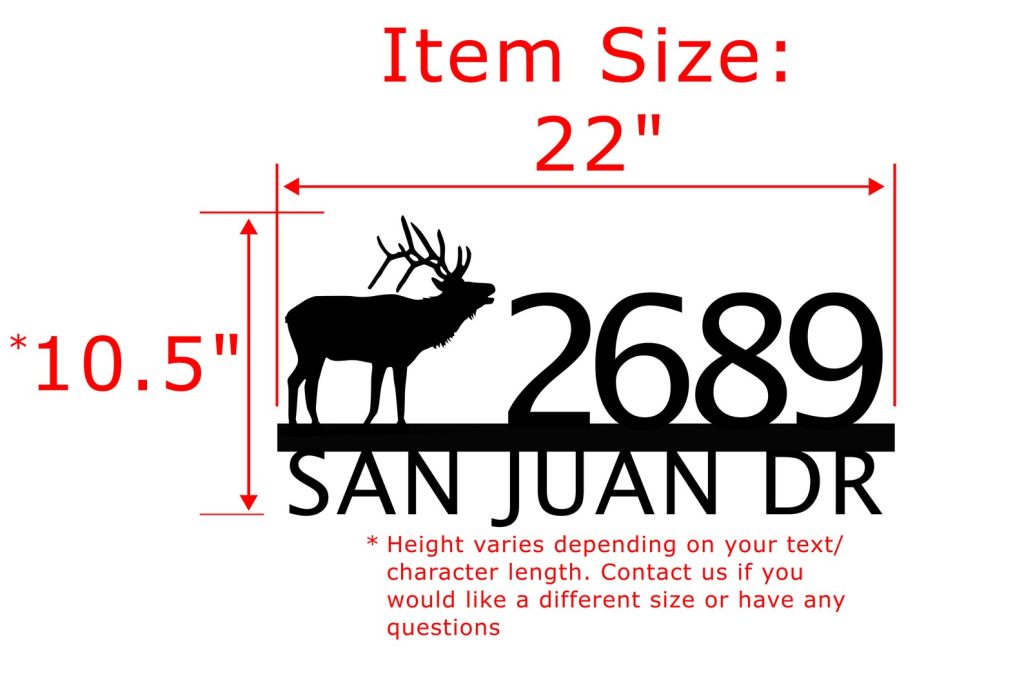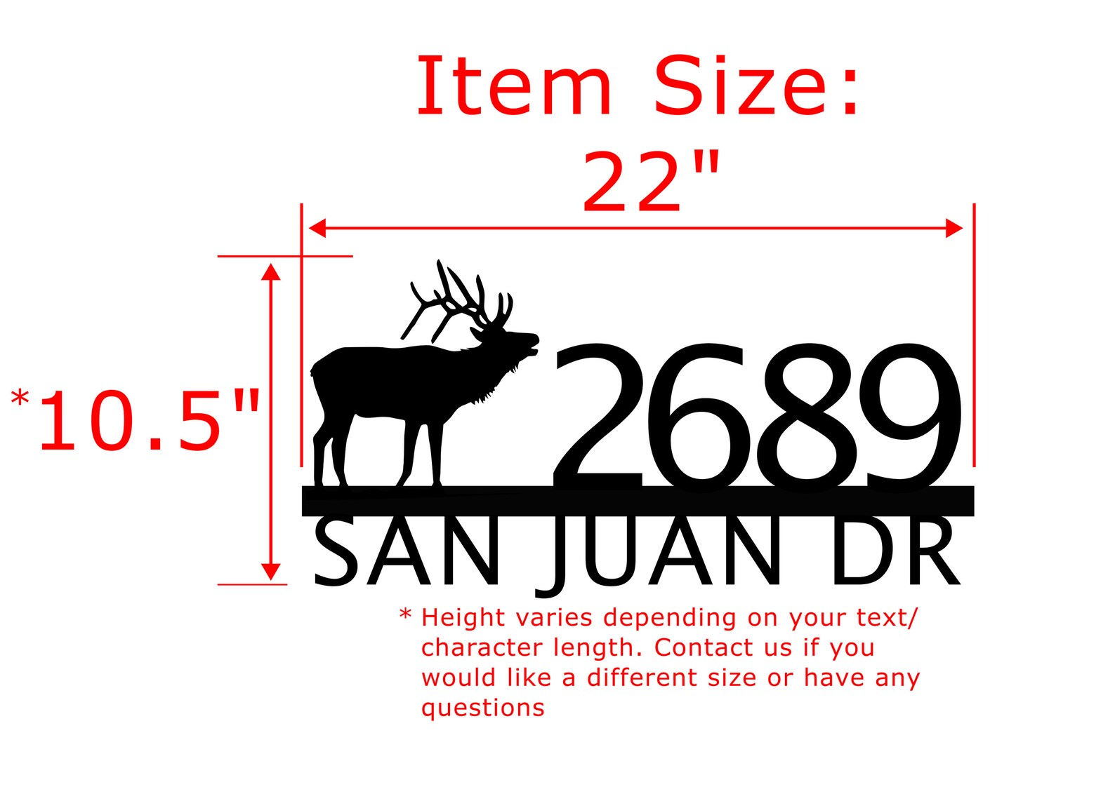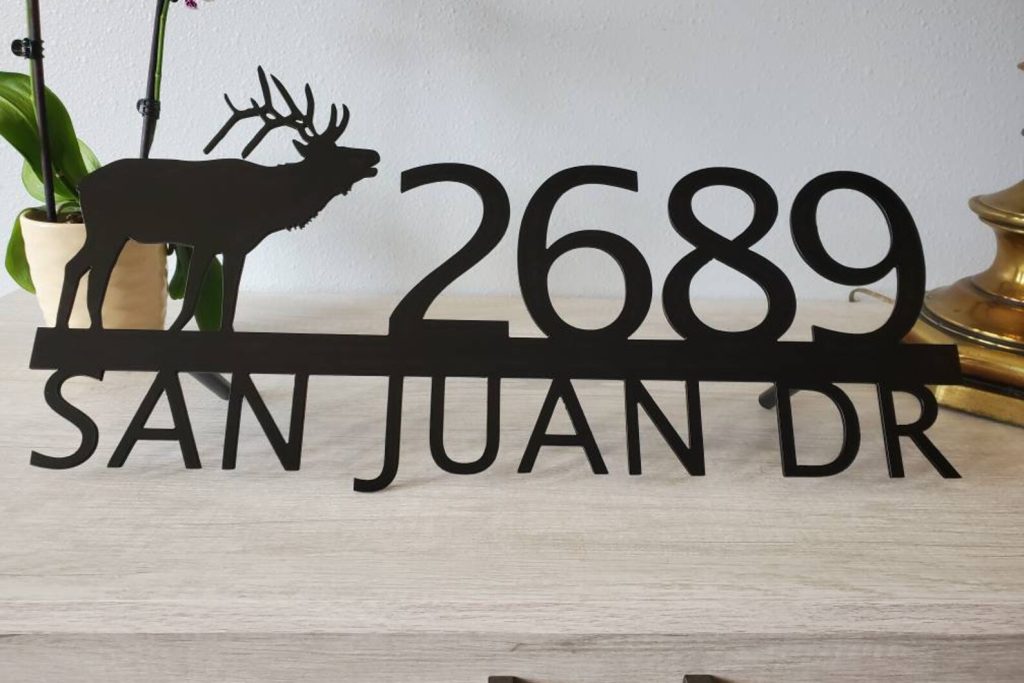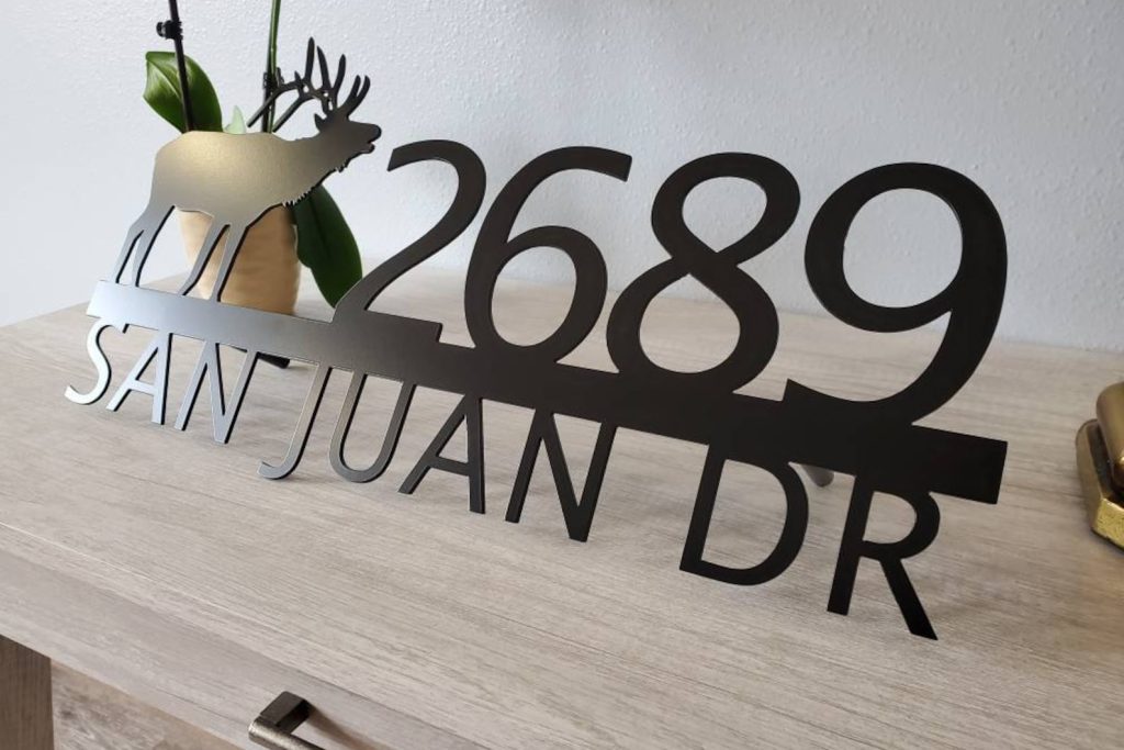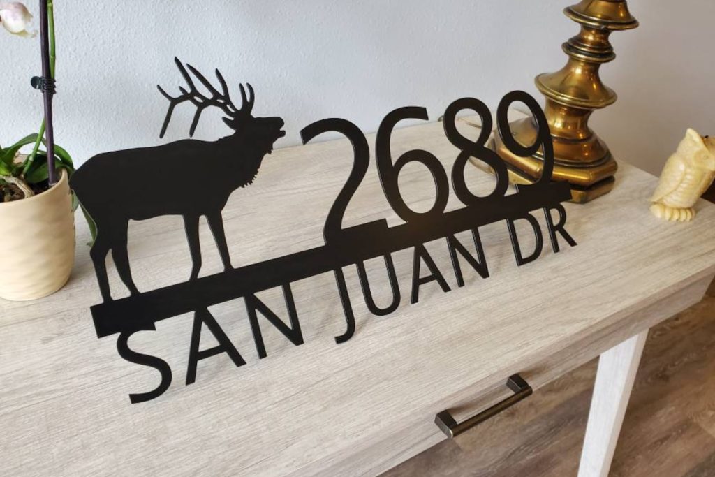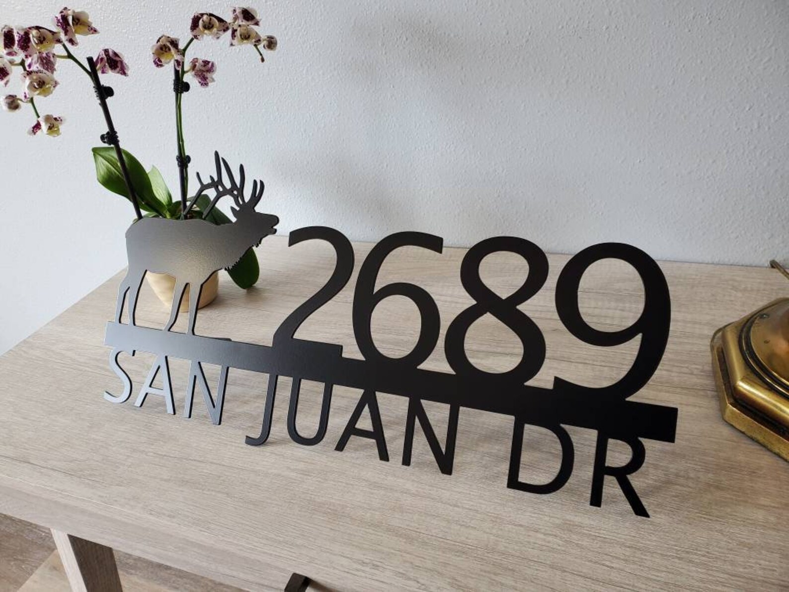 Custom metal personalized modern home house address sign, house numbers, plaque for your rock or wall with ELK design. Finished with highly durable exterior matte black powder coating. This address sign is made out of highly quality durable/sturdy 1/8 inch thick steel(12gauge). This gives the item a very sturdy feel. We do not use cheap thin metal.