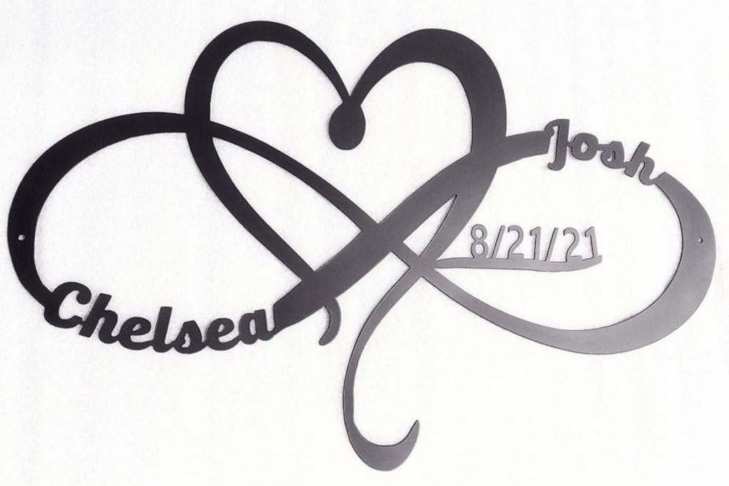 This listing is for a personalized heart and inifty metal sign with custom name, date, size and color!