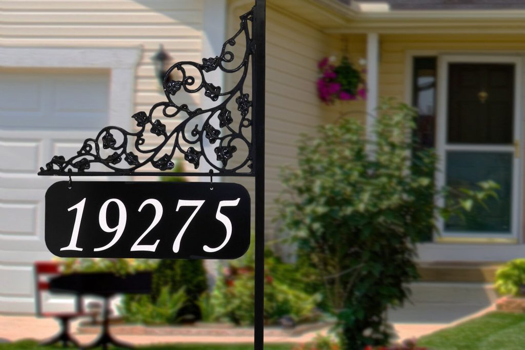 Don9;t let Emergency Personal or Anyone EVER miss your home again and Spice up your yard at the same time. Our Ivy Reflective ALL METAL Address Sign with Solar Lamp is double sided and custom made for you! The Beautiful Ivy Design bracket is made of solid aluminum. The hanging aluminum plaque is 14" x 12" and displays your address in 4.25" SUPER REFLECTIVE text. This sign is offered on a 58" Powder Coated Steel Post that goes directly into the ground 8" – 10" and topped with a soft glowing solar lamp.