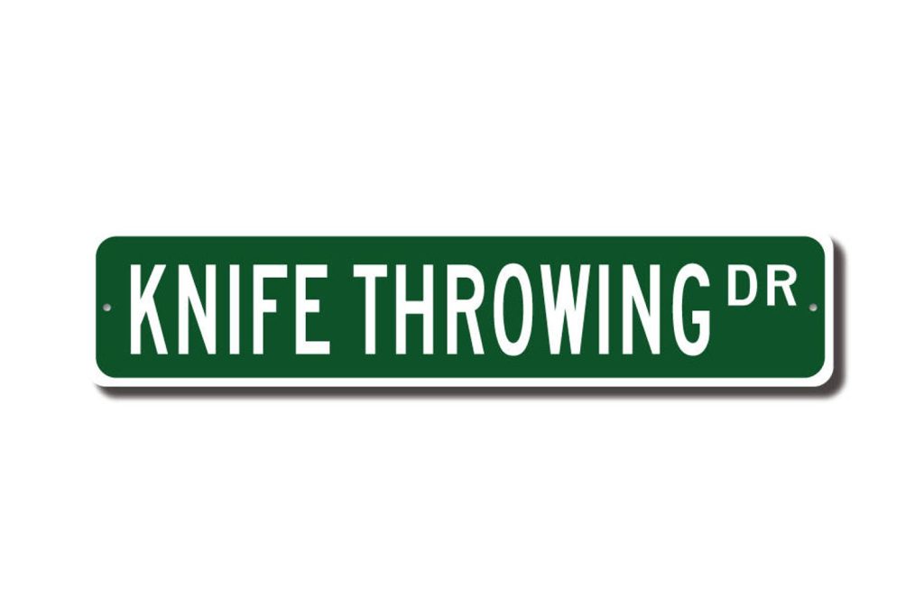 Knife Throwing lovers check out this awesome street sign! This will make the perfect piece for any Knife Throwing fan, or maybe you are a Knife Throwing lover looking for a cool decor piece ! Made of premium aluminum it will stand the test of time. This sign will look great in any room, home den, cave, or office ! Get this sign for your favorite Knife Throwing aficionado !