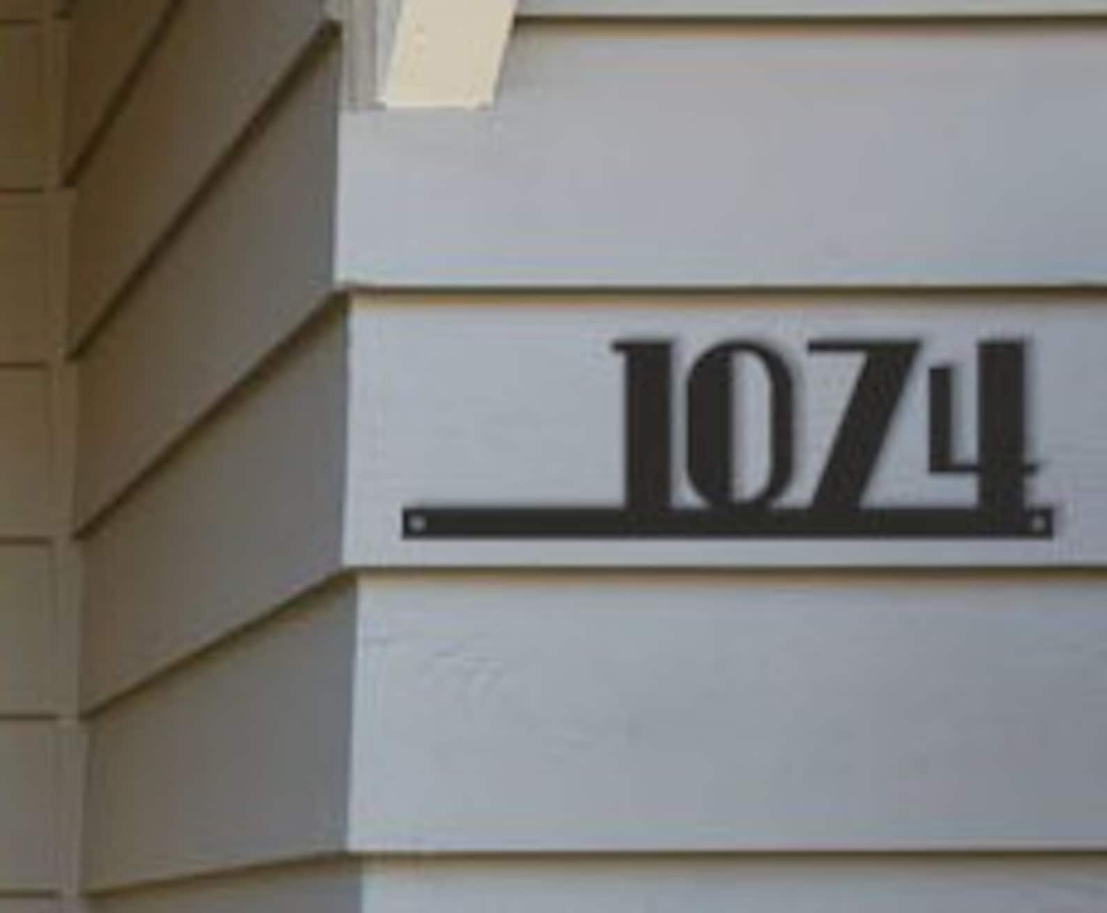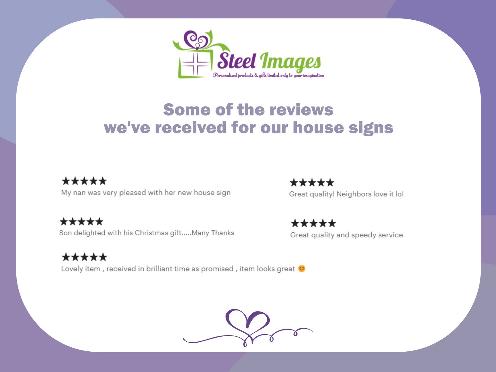A British made, high quality house plaque, featuring a unique design. Premium quality, durable and suitable for inside or outside this powder coated sign is the perfect way to clearly identify your house name, number, or both. Regular Size, suitable for numbers (250mm x 200mm x 2mm) Large Size, suitable for names and numbers (450mm x 400mm x 2mm) – 2mm Mild Steel – Powder Coated – Comes in black as standard – White vinyl lettering applied as standard – Please specify what you would like writing on your sign when ordering (Name, number or both)