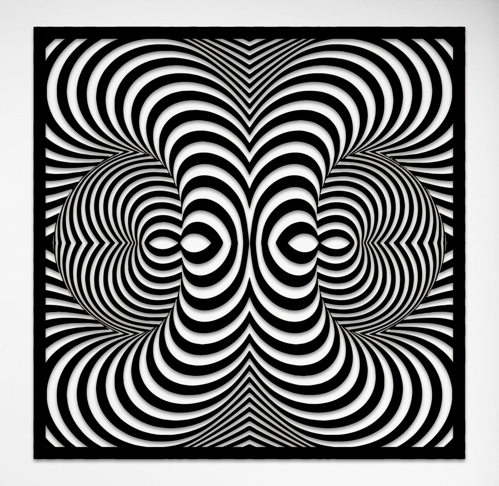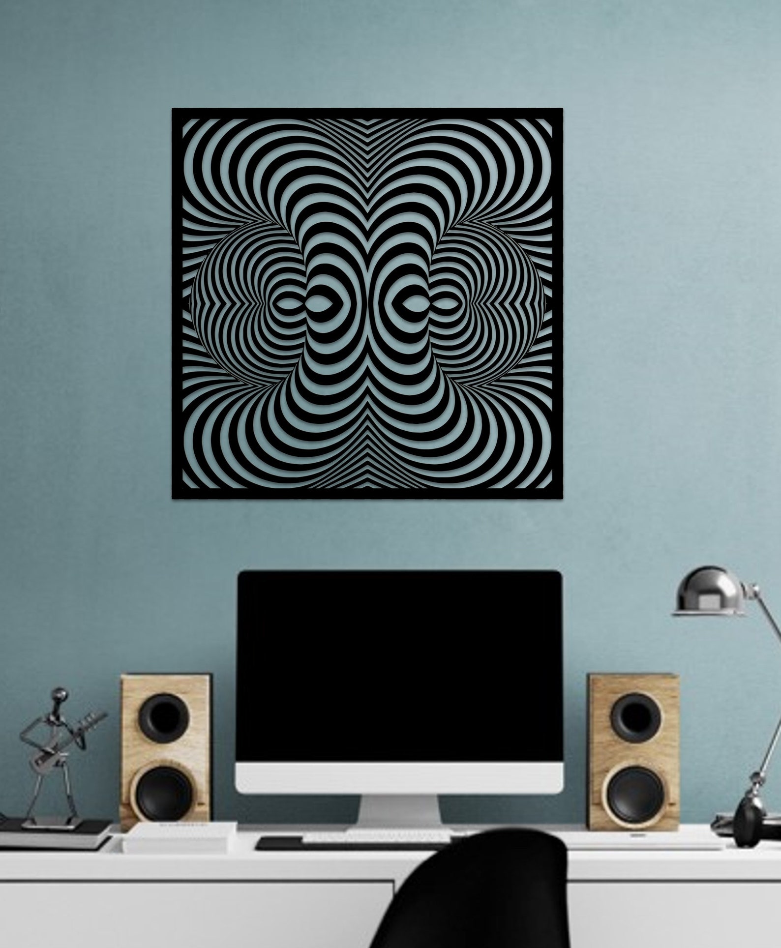 Hanging tools incl. The hanging parts thickness are 0.75 inches (2cm) . So There will be 0,75 inches (2cm) gap between wall and metal wall art that looks like 3D