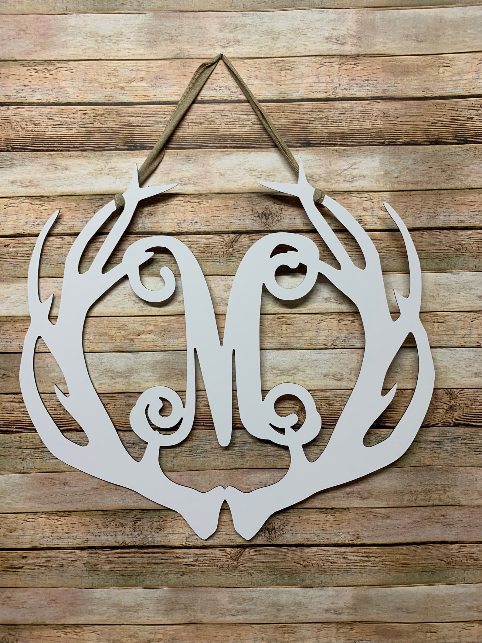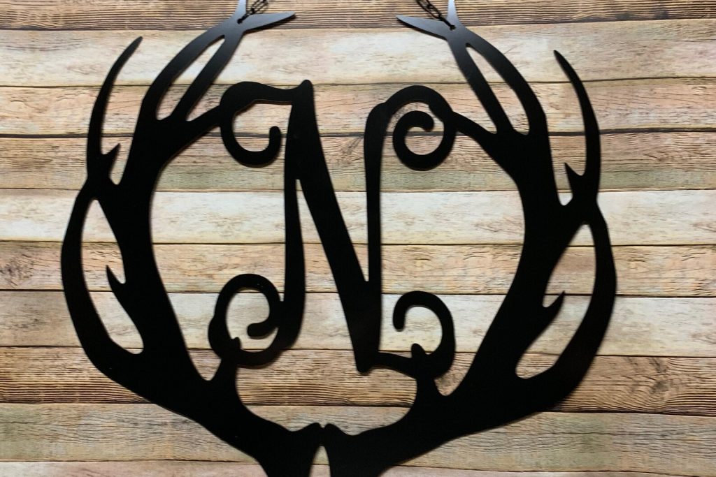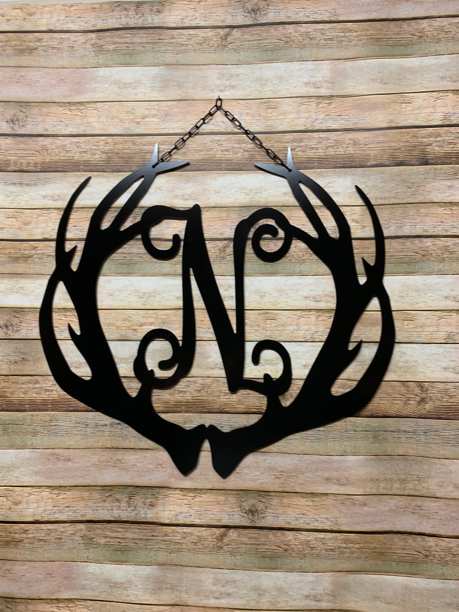This Antler Monogram Sign can be customized with vine script font or block font, with a variety of color options and mounting options to help you display inside or outside your home. Our unique metal acm material is weatherproof and will last! Read about this material below.