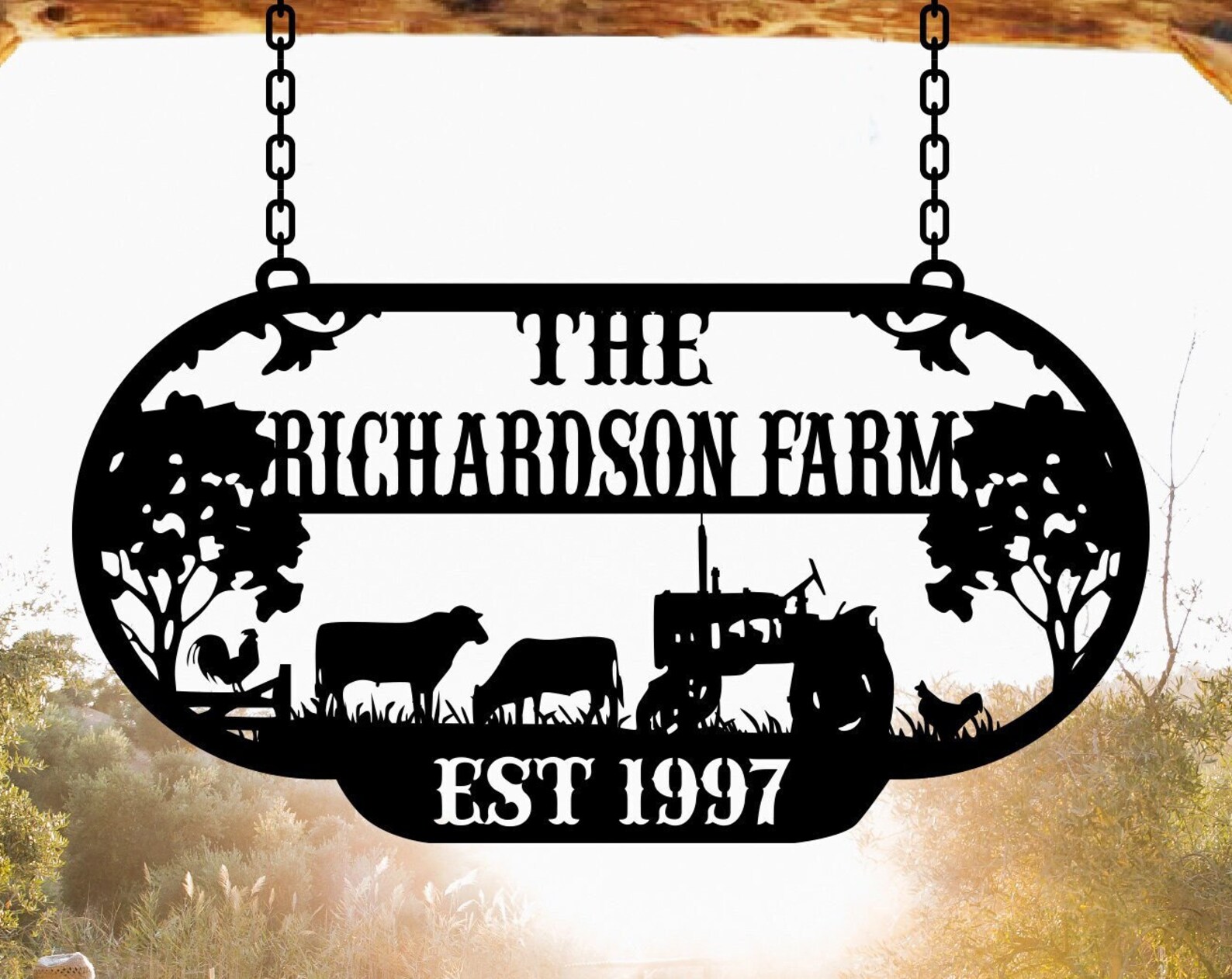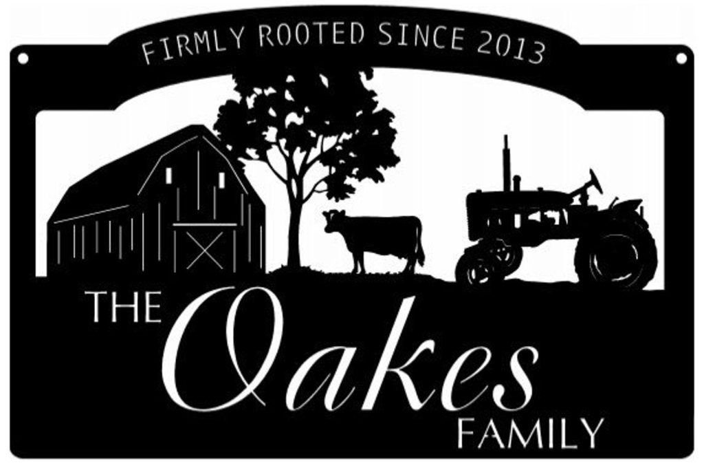 Rustic, personalized metal sign with old barn and and tractor scene . Measures 3 ft across by nearly 24tall and is finished in black powder coat finish or beautiful rustic acid wash finish and clear coated, . Makes a very attractive entrance sign. Incl with the price is customizing with your name. Our finish is a baked on powder coat for a very long lasting durable finish.