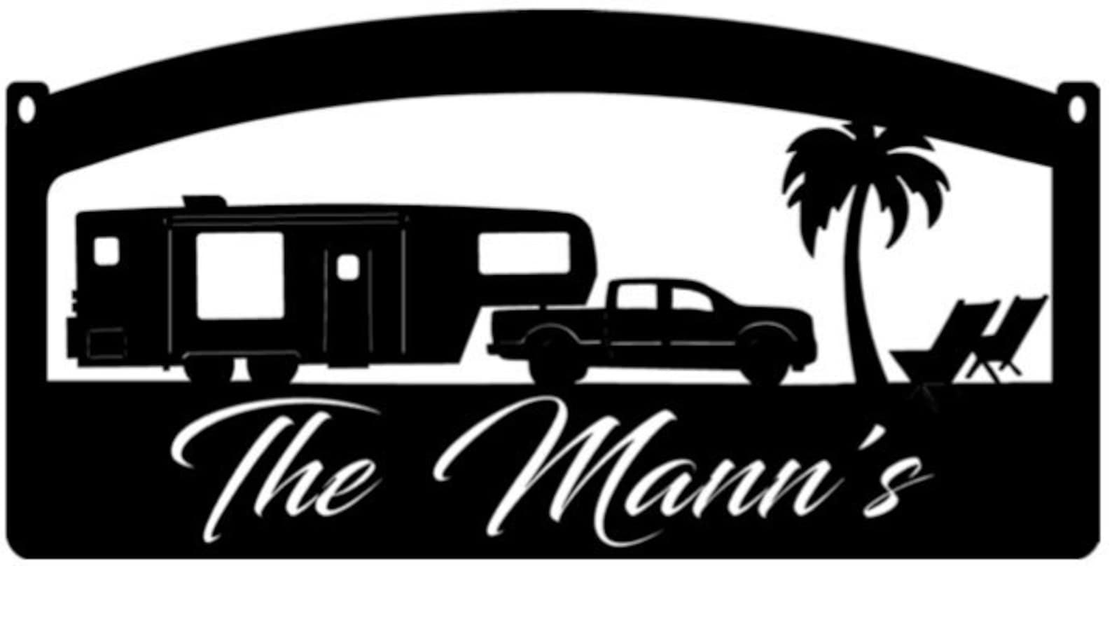 Metal laser cut sign with beach chairs and palm tree personalized with your name finished in durable, blackpowder coat or bronze, or copper acid wash with baked on clear coat, measures 26"". . Makes a very special gift! Great for the campground!