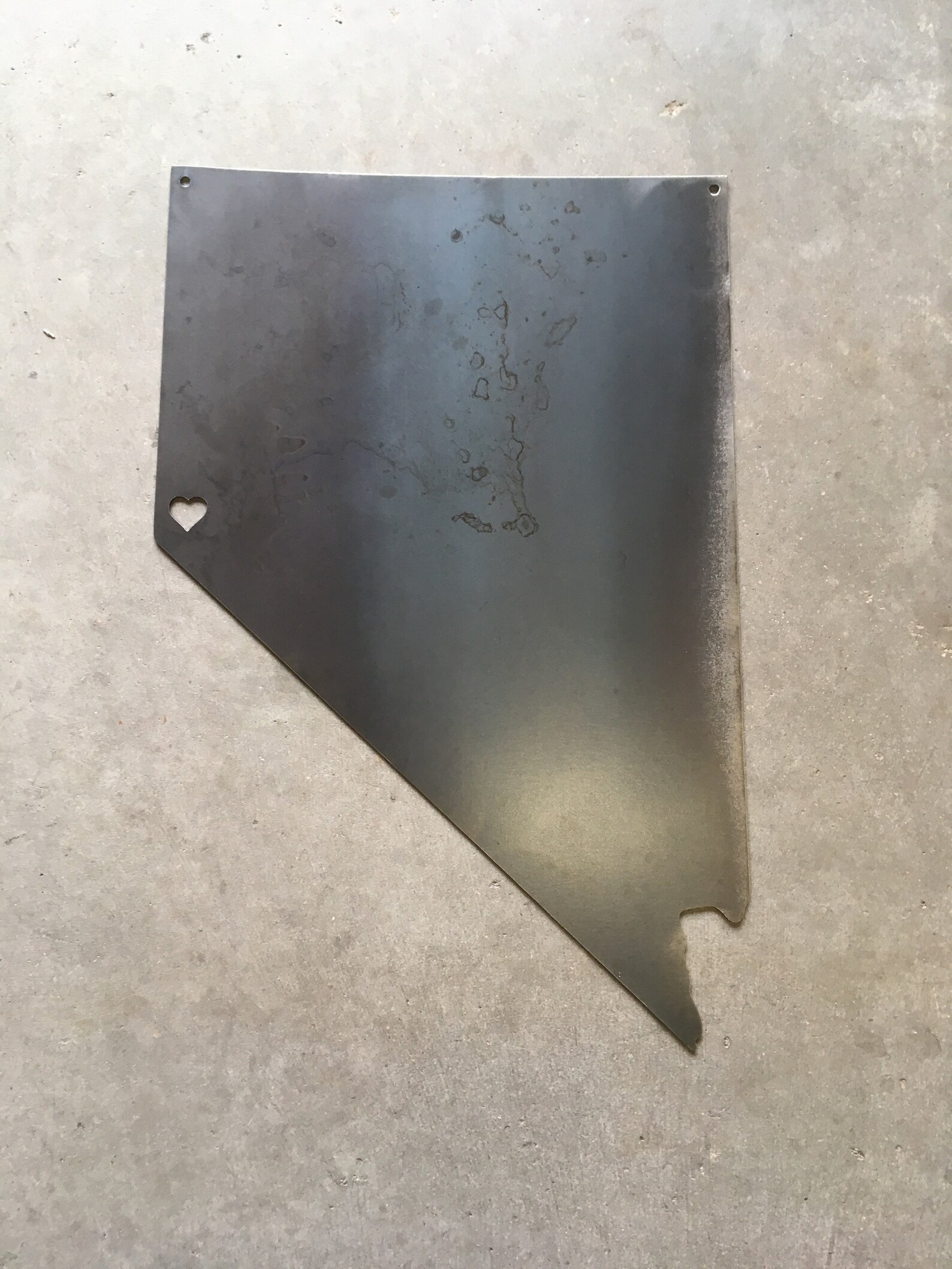 This metal state of Nevada sign with a custom placed heart (or star) will be the envy of all your friends. We use a plasma CNC table to create the outline of Nevada with a heart placed in your desired spot. This rustic metal sign can be clear coated to maintain a metal appearance or painted. This product is approximately 12" wide by 17" tall. Contact our shop to request a different state.
