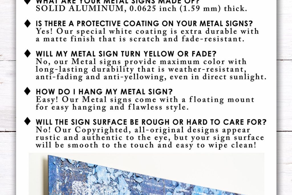 MATERIAL and FINISH: Toe Fish Art9;s metal prints are 0.0625 inch (1.59 mm) thick white-coated aluminum with a matte finish, providing a unique vintage style. Superior in quality, our signs are a *SOLID SHEET* of aluminum metal (-not- a fabricated, hybrid product of