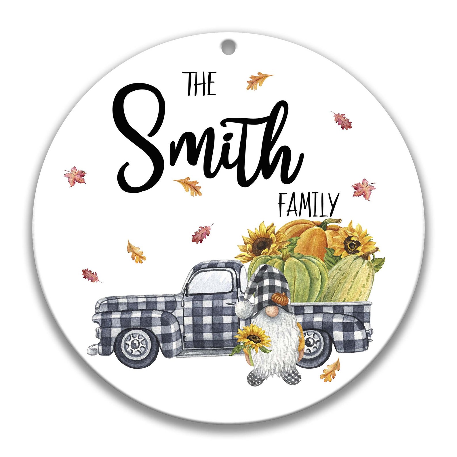 Personalized Gnome Sign, Buffalo Plaid Truck Gnome Fall Metal Sign, Round Gnome Signs, Autumn Pumpkin Patch Fall Gnome Decor Custom 7-FAL009
