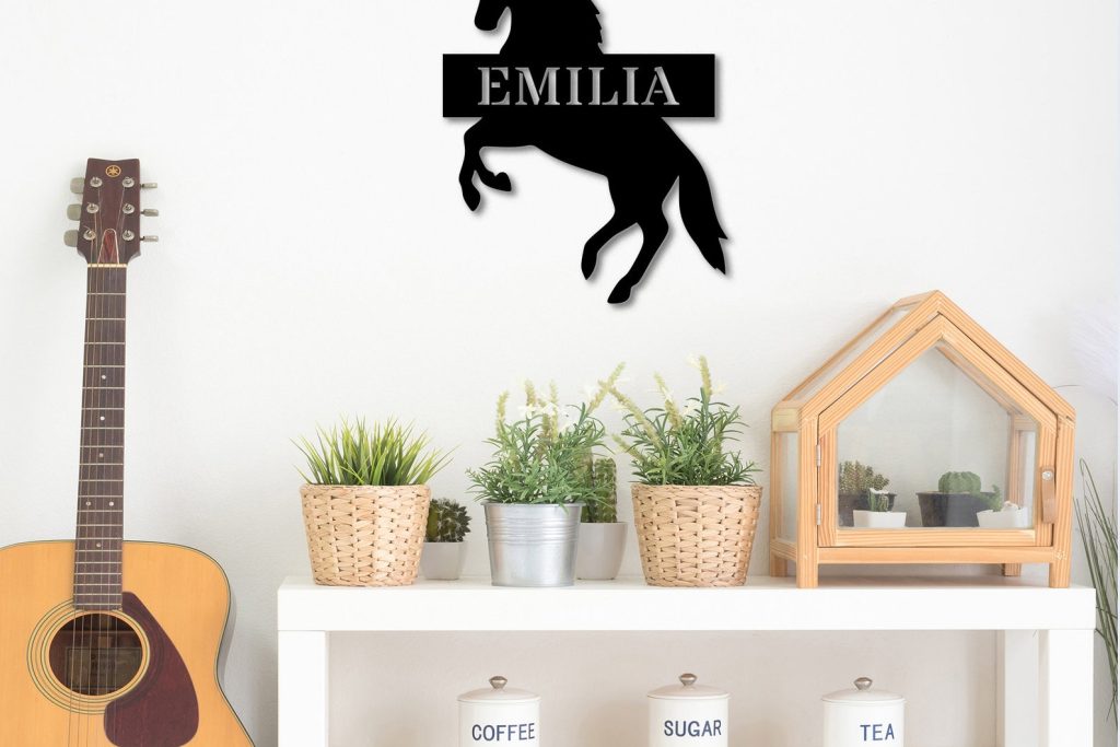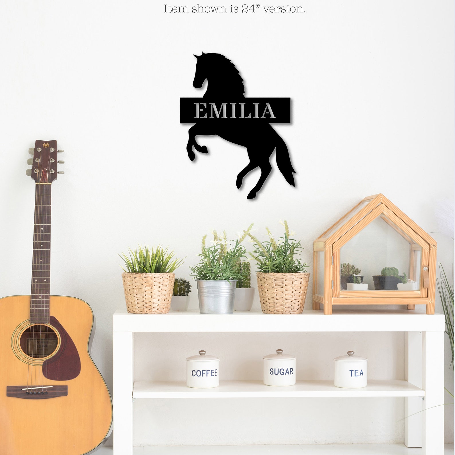 This Horse Silhouette Personalized Metal Wall Sign is an impressive Custom Horse Metal Name Sign IDEAL for the Horse Lover Gift this holiday season. Perfect Christmas Gift, Horse Lover Gift, Equestrian Gift, Birthday Gift or simply a girl room decor Gift. It is the perfect Equestrian Decor for the Horse Lover in your family. This horse metal sign will complement the equestrian bedroom, the barn stall or the rustic log cabin or farmhouse entrance. This metal sign can be a wall hanging accent Indoor or Outdoor. Horses are forever in the heart of a horse girl.