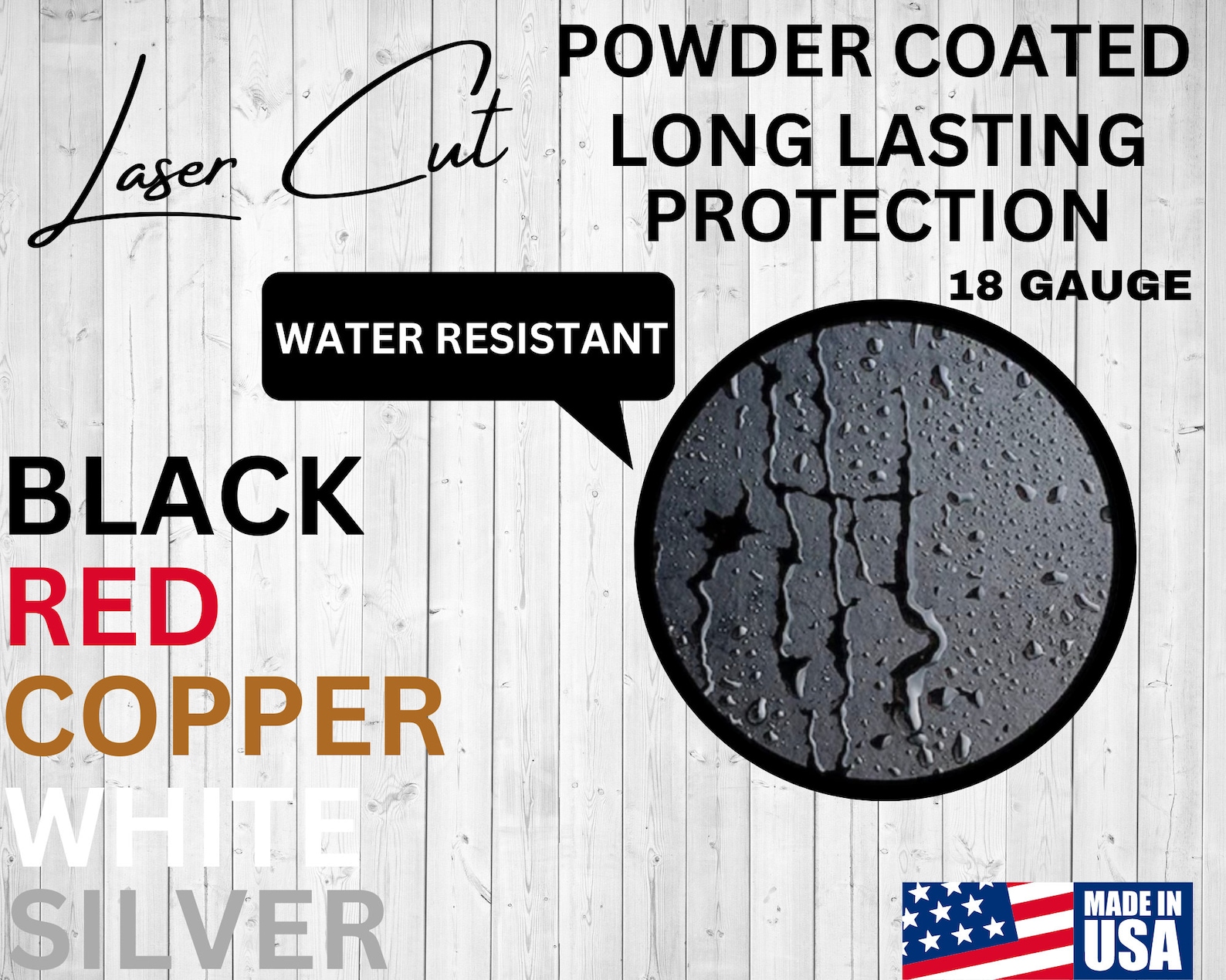 These signs are made from laser cut steel and powder coated for long lasting durability.