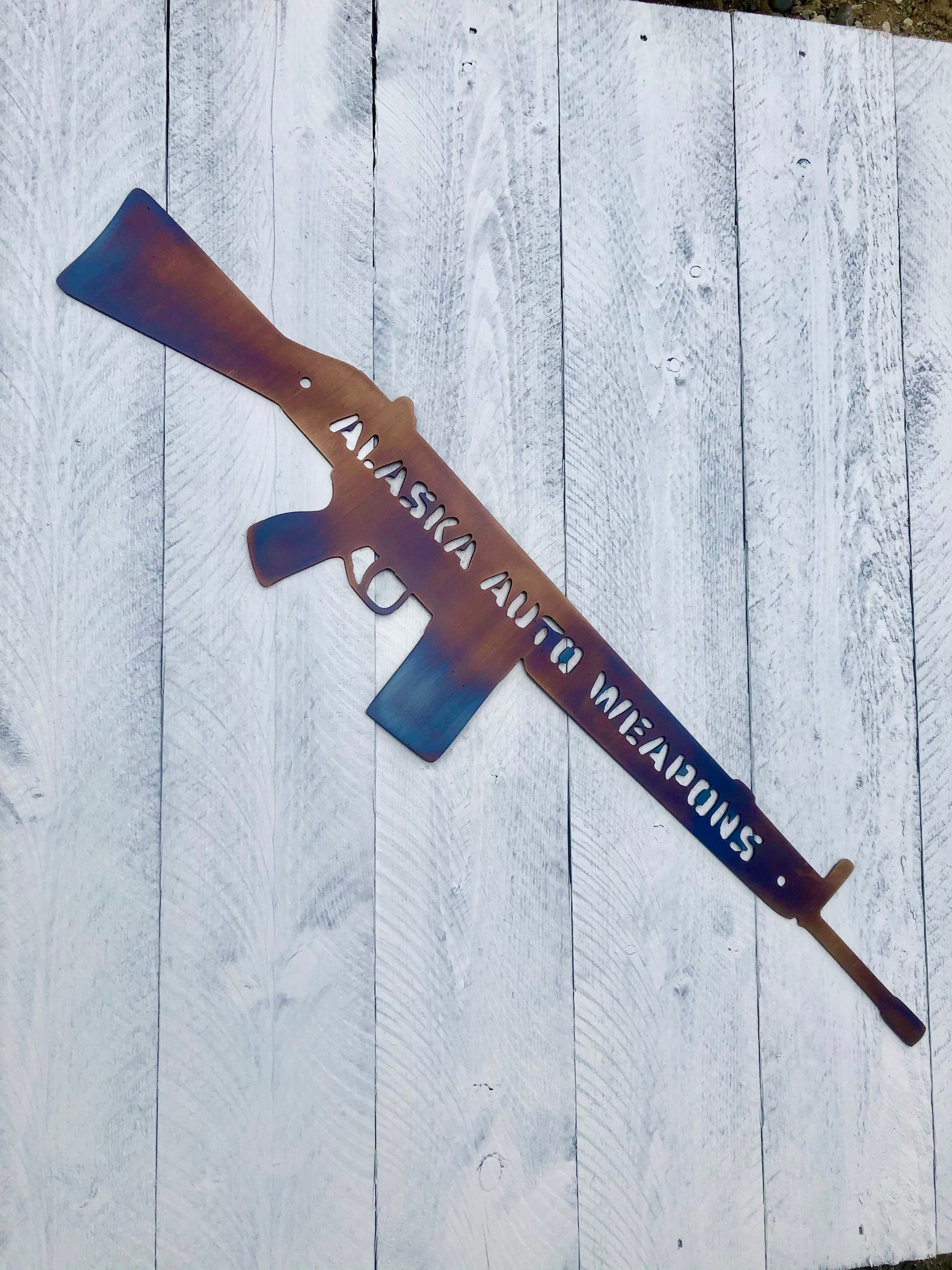 The perfect Father9;s Day gift for the gun enthusiast in your life. An AK-47 cut from 16 gauge steel to hang on the door of HIS (or her) space. Custom words also available. Send a message upon purchase with personalization if desired. Painted black unless otherwise requested.