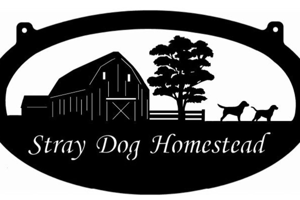 Rustic, personalized metal sign with barn , dog scene . Measures 3 ft across by 20" tall. Also available in other sizes. Just ask!
